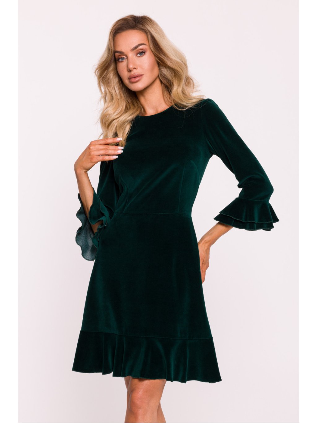 Krásné šaty z velurového úpletu, které kombinují pohodlí s elegantním stylem. Střih v pase dokonale zvýrazňuje siluetu a výstřih dodává klasický nádech. Dlouhé rukávy v délce 7/8 zakončené volánkem dodávají jemný půvab a dívčí šarm. Spodní část šatů, rovněž zakončená volánem, přináší lehkost a pohyb a délka ke kolenům je ideální pro různé příležitosti. Skrytý zip na zádech zajišťuje pohodlné zapínání a díky absenci podšívky jsou šaty lehké a pohodlné na nošení. Šaty byly navrženy a ušity v Polsku a jsou ideální volbou pro ženy, které ocení kombinaci módního vzhledu a každodenního pohodlí.
