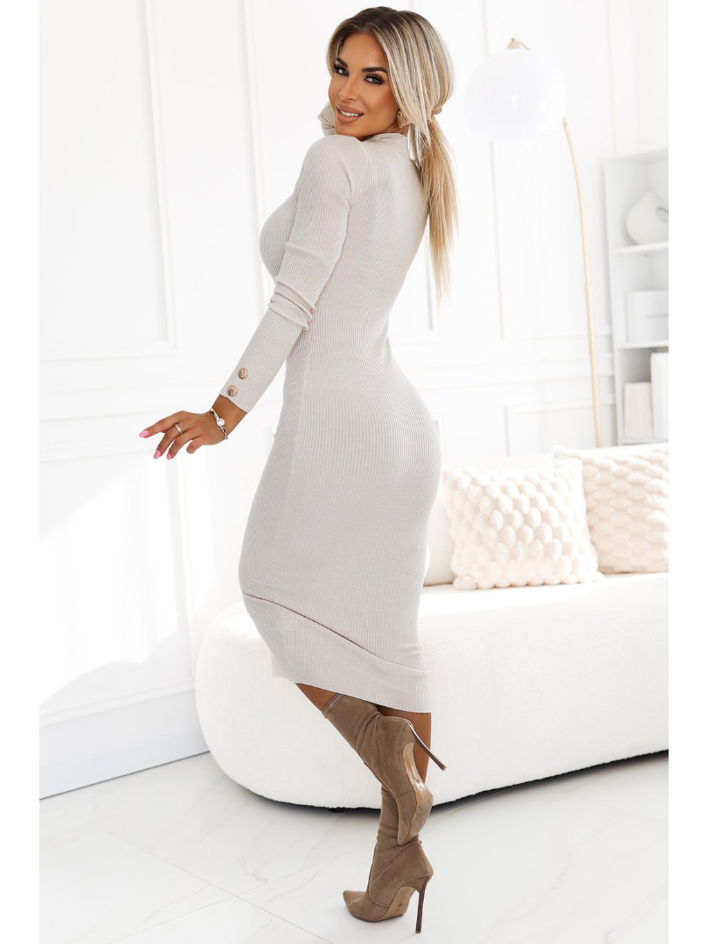 Svetrové pletené šaty značky Numoco Basic jsou přizpůsobeným návrhem ve střední délce. Vyrobené z pruhovaného béžového materiálu. Šaty jsou charakterizovány elegantními zlatými knoflíky a rolákem, což jim dodává eleganci a stylový charakter. Ideální na chladnější dny, kombinují pohodlí s módním, ženským střihem, zdůrazňujícím postavu. Skvělá volba na každodenní i elegantní příležitosti.