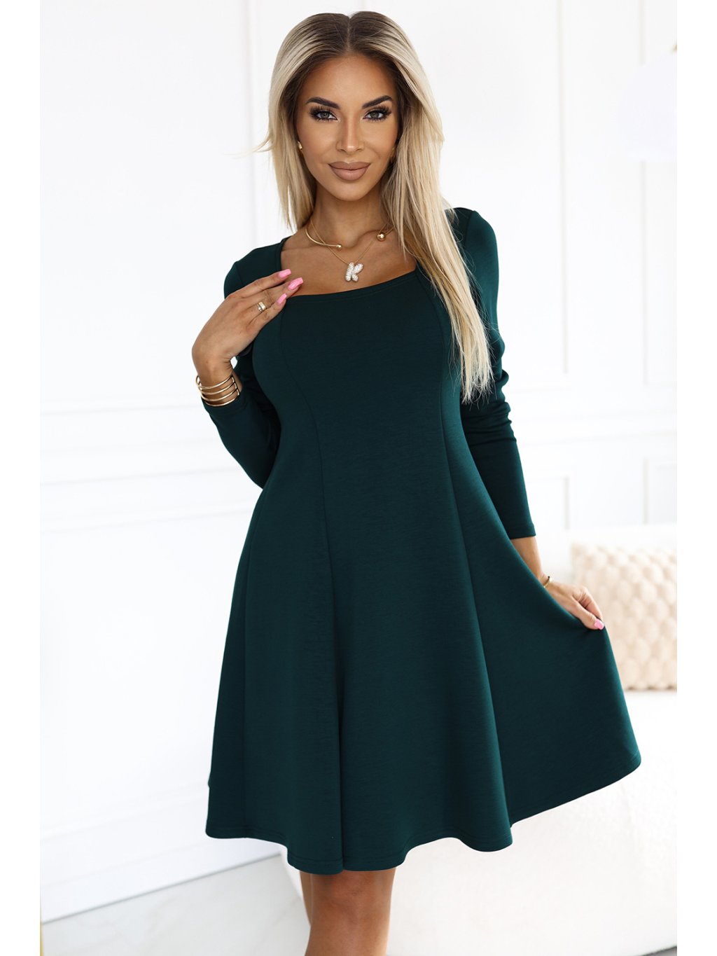IVANA je pohodlné trapézové šaty značky Numoco, vyznačující se jednoduchým střihem s výstřihem a dlouhými rukávy. Vyrobena z elastické zelené pleteniny, která se skvěle přizpůsobuje postavě, poskytující volnost pohybu a pohodlí při nošení. Polská výroba je zárukou kvality a preciznosti provedení.