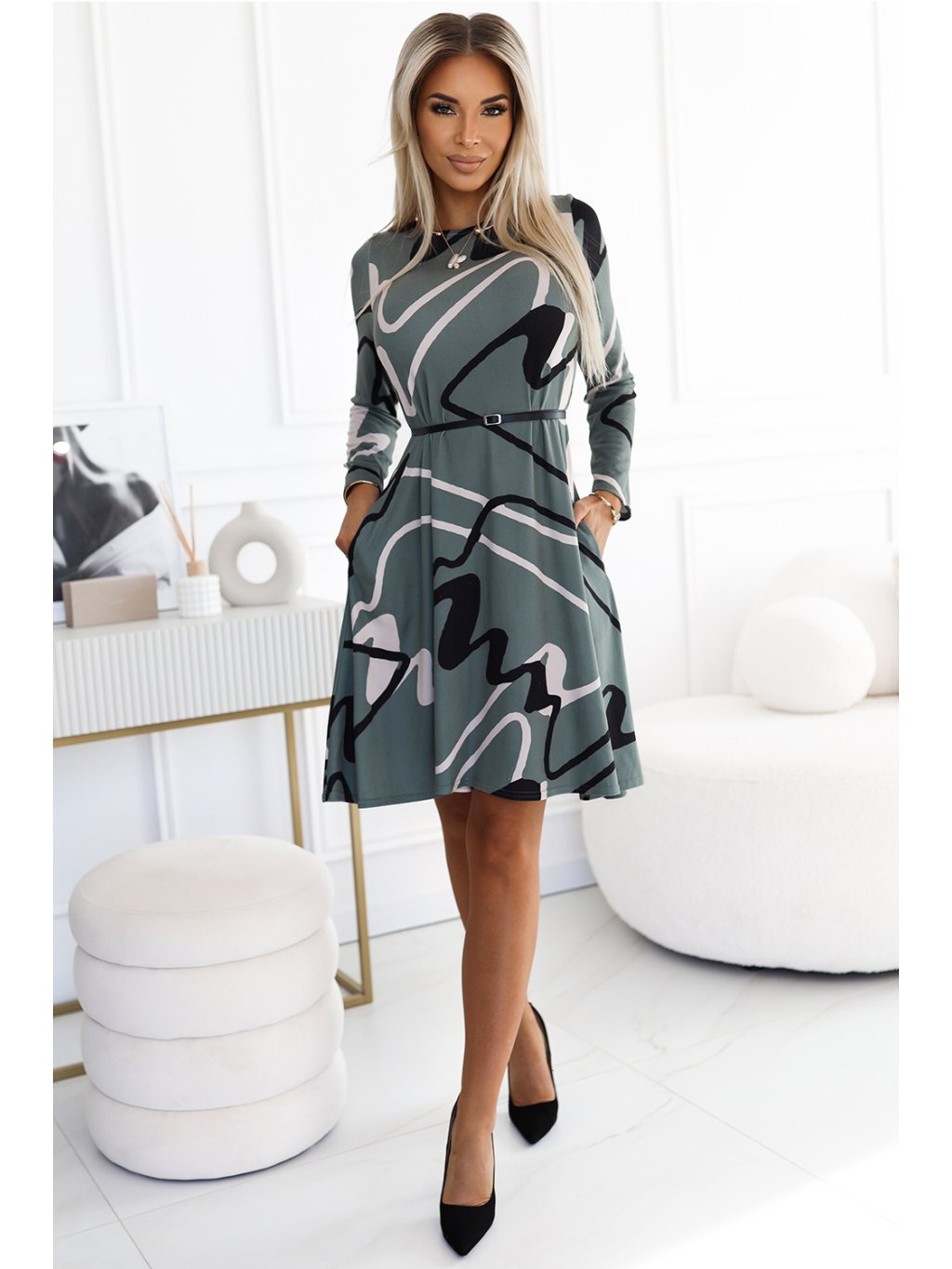 Trapezové šaty značky Numoco jsou pohodlným návrhem na chladné dny. Vyrobena z teplého materiálu v olivově-černo-béžovém vzoru, skvěle se hodí do každodenních stylizací. Šaty mají dlouhý rukáv, kapsy na sukní a černý pásek, který lze volitelně nosit k podtržení pasu. Polský výrobek s volným, moderním střihem.