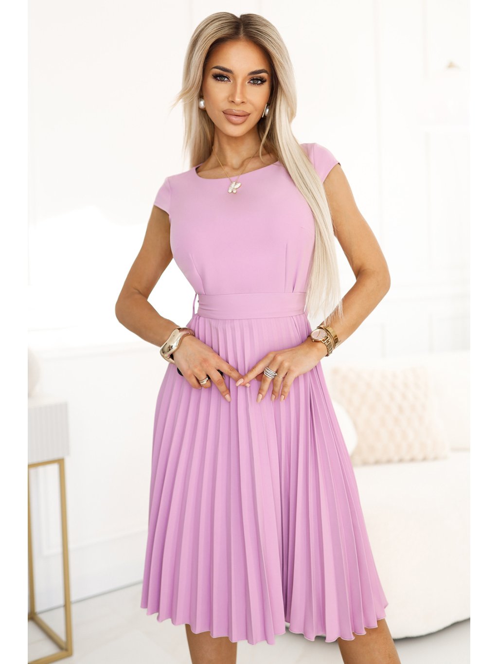 Elegantní plisované midi šaty v barvě levandule jsou ideální volbou pro ženy, které ocení styl a pohodlí. Vyrobena z lehkého plisovaného materiálu krásně padne na postavě, zdůrazňuje její přednosti. Pásek, který lze uvázat do mašle, dodává romantický nádech a zdůrazňuje pas. Krátký rukáv poskytuje volnost pohybu, a skrytý zip na zádech zaručuje ideální přizpůsobení. Skvělá na elegantní akce, letní večírky a rodinné oslavy. Polský výrobek. Značka Numoco.