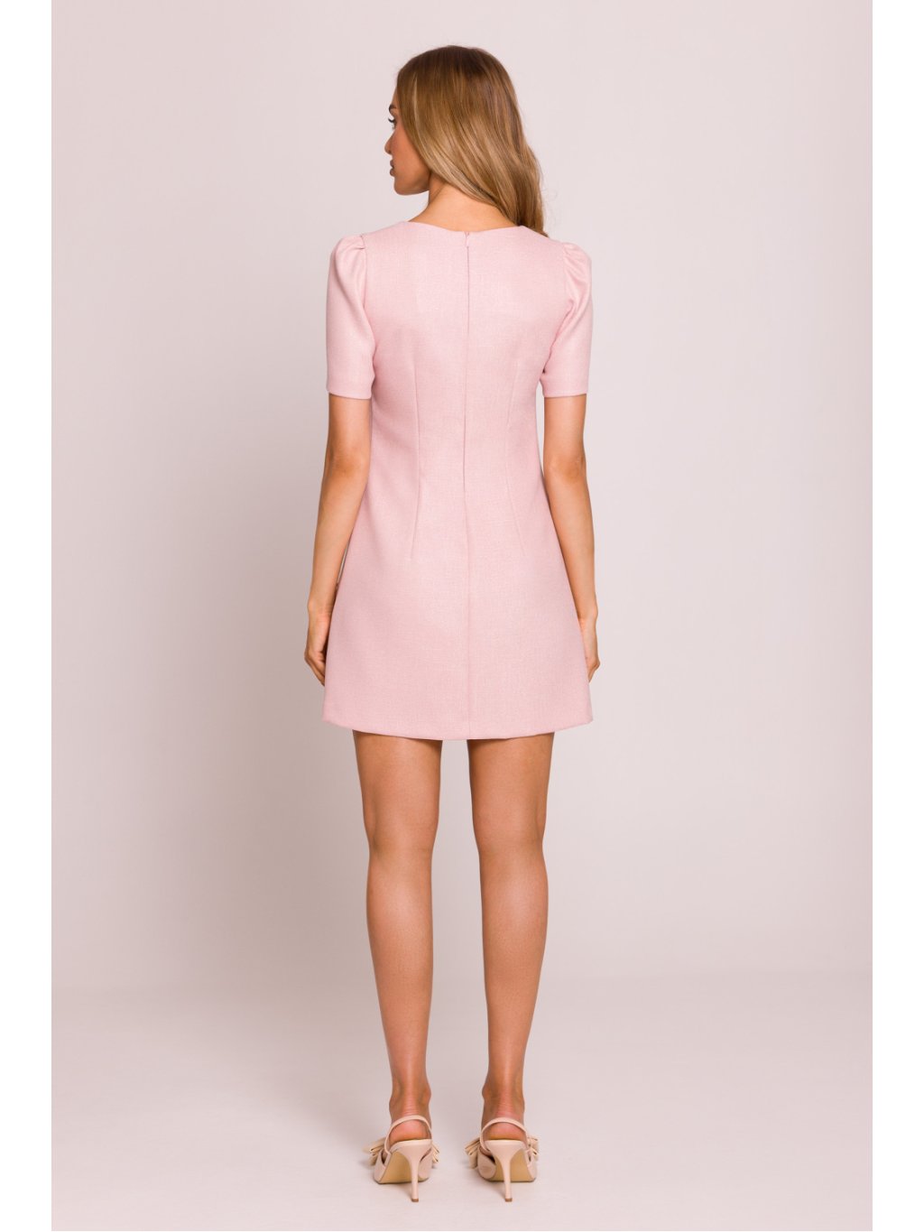 Půvabné mini šaty ve tvaru trapezu, vyrobené z elegantní látky, která krásně padne na postavu. Model je zdobený krátkými nafouklými rukávy, které dodávají lehkost a romantický charakter. V přední části jsou ozdobné kapsy se zlatými srdcovitými knoflíky, které jí dodávají jedinečný půvab. Šaty se zapínají vzadu na skrytý zip, co zajišťuje pohodlné nošení a estetické dokončení. Bez podšívky jsou lehké a prodyšné. Celý kousek je navržen a ušit v Polsku s důrazem na každý detail.