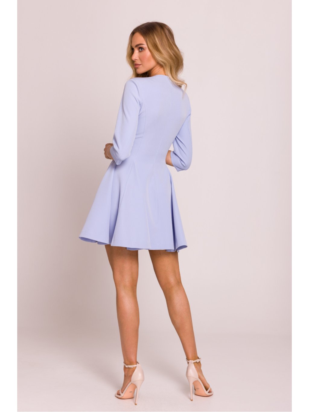 Pohodlné mini šaty vyrobené z hladké látky, spojující lehkost a ženský styl. Rozšířený spodek s klíny jí dodává lehkost a eleganci, zatímco rukávy po loket zajišťují decentní dokončení. Hluboký výstřih ve tvaru písmene V krásně zdůrazňuje krk a dekolt. V pasu dva ozdobné knoflíky přidávají výjimečný akcent a zvýrazňují postavu. Šaty se zapínají vzadu na skrytý zip, co zaručuje ideální přizpůsobení. Bez podšívky jsou lehké a pohodlné. Navrženy a ušity v Polsku s důrazem na každý detail.