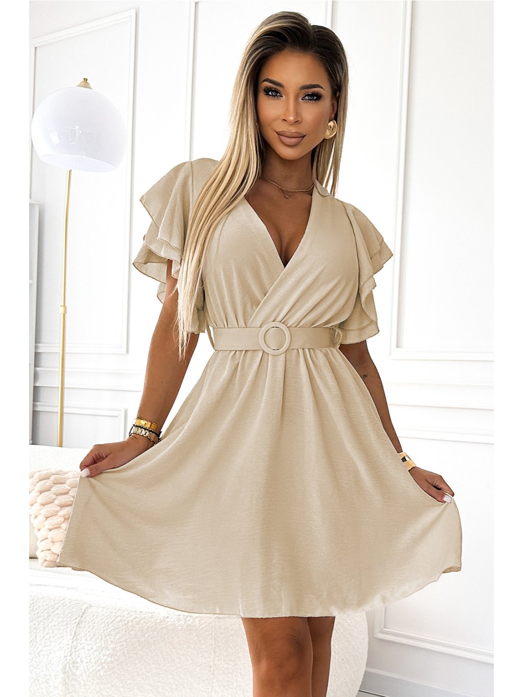 Jedinečná nabídka pro moderní ženy šaty, které spojují pohodlí s moderním elegantním designem. Volné rukávy a volná sukně zajistí pohodlí při nošení, zatímco zavinový výstřih dodá celku jemnou ženskost. Široký pás krásně zdůrazní pas a dodá postavě smyslný výraz. Vyrobeno z křížené látky v klasické béžové barvě. Šaty značky numoco basic jsou zárukou stylu. Evropský produkt.