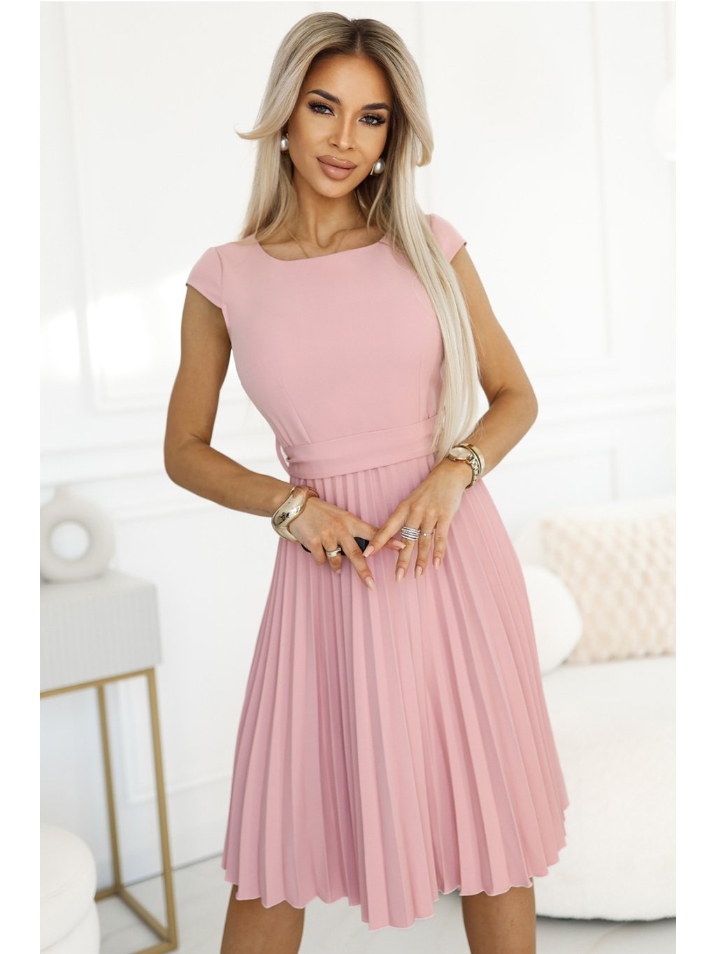 Elegantní plisované midi šaty v odstínu pudrové růže jsou skvělým návrhem pro ženy, které ocení styl a pohodlí. Vyrobené z lehkého plisovaného materiálu jemně obepínají postavu, zdůrazňují její výhody. Pásek, který lze zavázat do efektní mašle, zdůrazňuje pas a dodává kreaci romantický charakter. Krátký rukáv zajišťuje pohodlí a skrytý zip na zádech zaručuje perfektní přizpůsobení. Ideální na elegantní večírky, letní události a rodinná setkání. Polský výrobek. Značka Numoco.