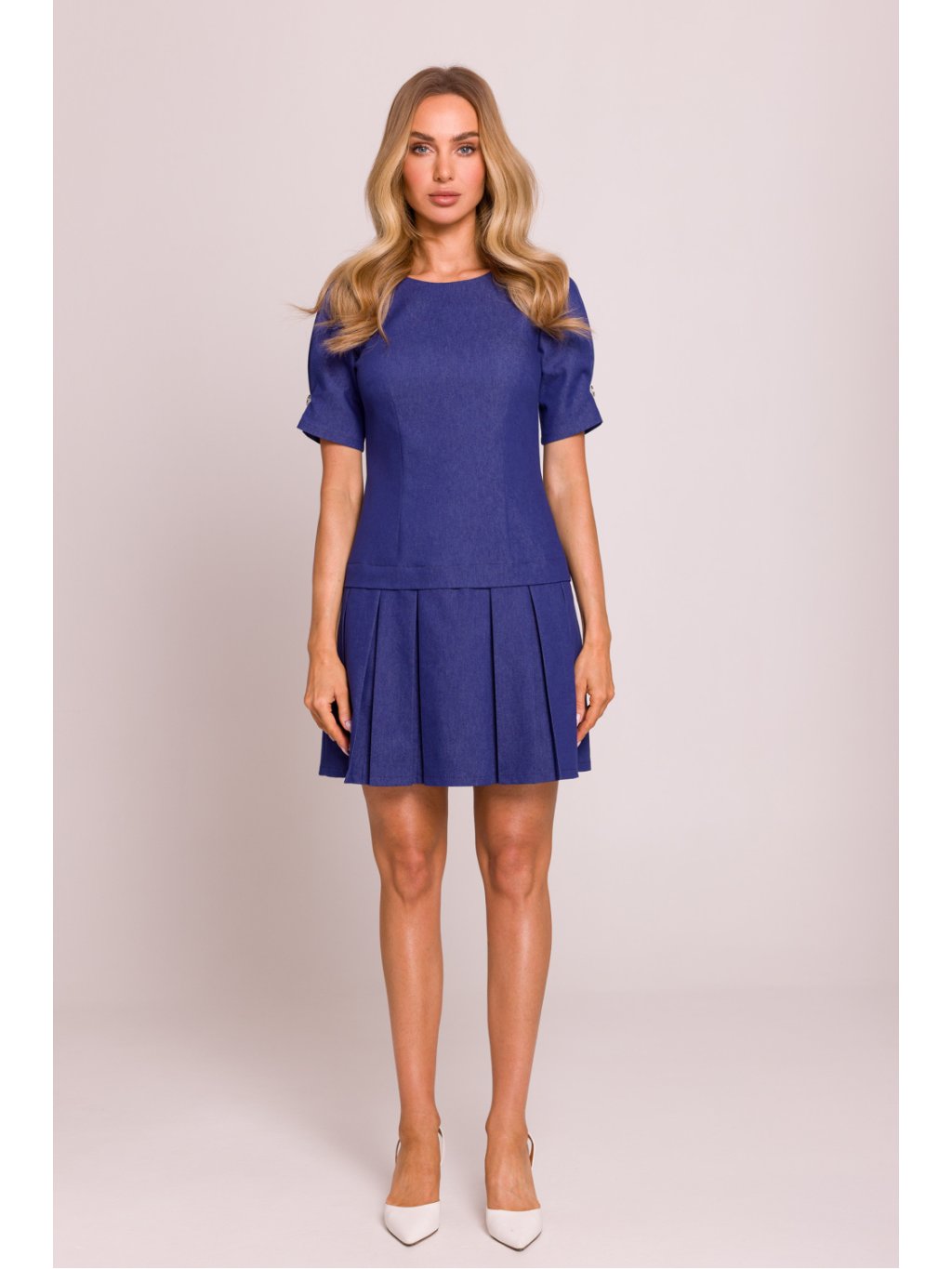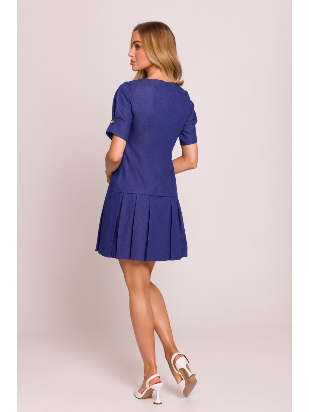 Šaty mini vyrobené z vysoce kvalitní bavlněné látky, která zajistí pohodlí a prodyšnost. Střih s mírně sníženým pasem jemně zdůrazňuje postavu, a kontrafaldy v dolní části dodávají lehkost a eleganci. Krátké rukávy zdobené záložkami a dekorativními knoflíky dodávají celku zvláštní charakter. Šaty se zapínají na skrytý zip na zádech, bez podšívky, co zajišťuje, že jsou lehké a příjemné na nošení. Navrženo a ušito v Polsku s důrazem na každý detail.