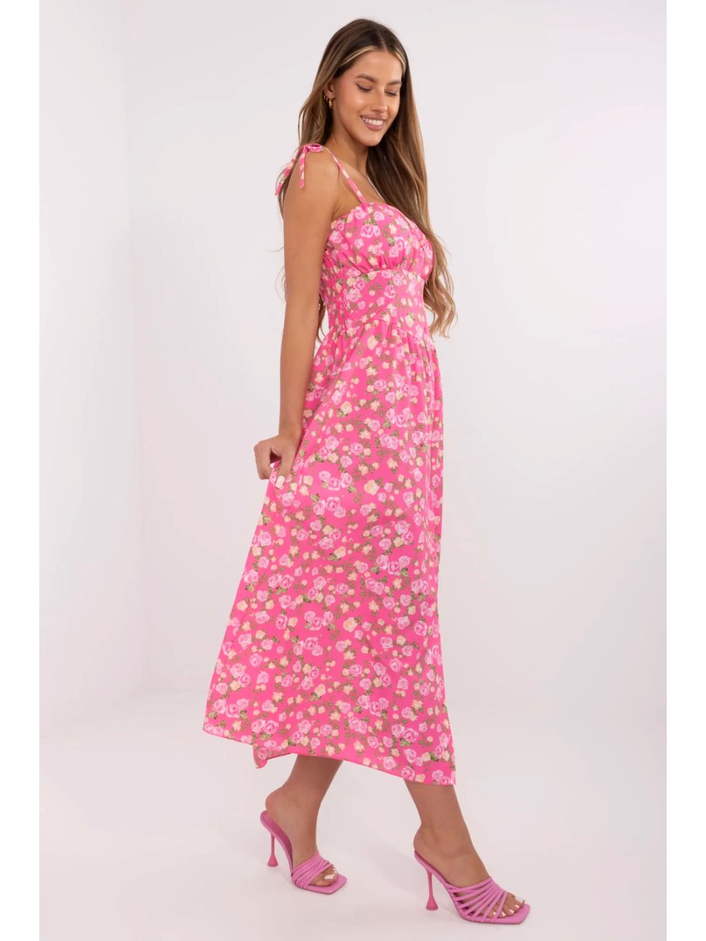 Elegantní a pohodlné šaty na každý den s ženským rozkročeným střihem. Midi model s obdélníkovým výstřihem a vázanými ramínky, které umožňují perfektní přizpůsobení délky a zajišťují pohodlí nošení. Korsážový pas krásně zdůrazňuje siluetu a vestavěné zpevněné košíčky poskytují další podporu prsou, díky čemuž můžete nosit šaty bez podprsenky. Na zádech jsou záhyby, které nejen dodávají šatům kouzlo, ale také zvyšují elasticitu a pohodlí nošení. Zapínání na knoflíky podél přední části jí dodává dívčí charakter a usnadňuje oblékání. Stylový květinový vzor přitahuje pozornost a zapadá do nejnovějších trendů. Vyrobeno z prodyšného materiálu, směsi polyesteru a elastanu, který zajišťuje volnost pohybu a perfektní přizpůsobení tělu. Skvělý návrh na každodenní vycházky, setkání s přáteli nebo volné letní procházky, vždy tehdy, když chcete vypadat stylově, ale cítit se volně.