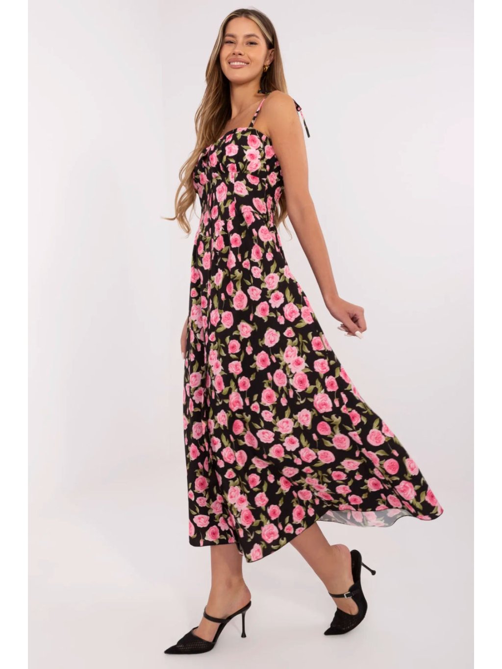 Elegantní a pohodlné šaty na každý den s ženským rozkročeným střihem. Midi model s obdélníkovým výstřihem a vázanými ramínky, které umožňují ideální přizpůsobení délky a zajišťují pohodlí nošení. Korzetový pas krásně zdůrazňuje postavu a vestavěné zpevněné košíčky poskytují dodatečnou oporu prsou, díky čemuž je možné nosit šaty i bez podprsenky. Na zádech jsou rimplované záhyby, které šatě dodávají kouzlo a zvyšují elasticitu a pohodlí nošení. Zapínání na knoflíky po celé délce přední části jí dodává dívčí charakter a usnadňuje oblékání. Moderní květinový vzor přitahuje pozornost a zapadá do nejnovějších trendů. Vyrobeno z prodyšného materiálu, směsi polyesteru a elastanu, který zajišťuje volnost pohybu a ideální přizpůsobení tělu. Skvělý návrh na každodenní vycházky, setkání s přáteli nebo volné letní procházky, vždy, když chcete vypadat stylově, ale cítit se volně.