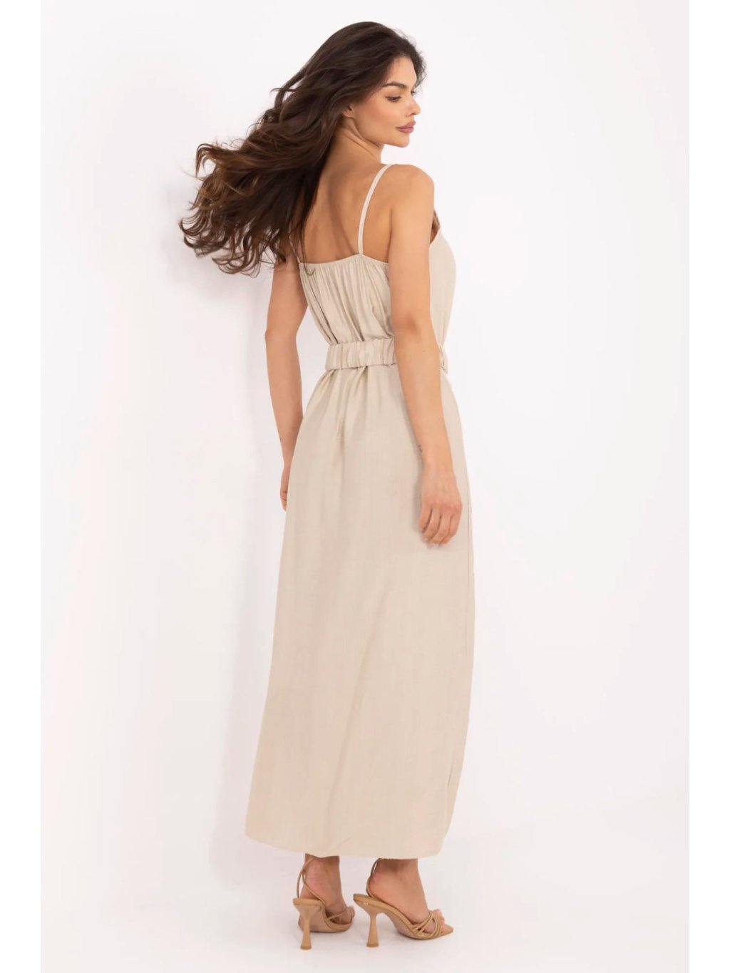 Tato stylová maxi šaty jsou ideálním návrhem na teplé letní dny. Vyrobena z prodyšné viskózy, poskytuje pohodlí nošení a skvěle se hodí do každodenních stylizací. Jednoduchý střih v kombinaci s hladkým, jednolitým materiálem jí dodává elegantní jednoduchost, která se hodí jak na procházku, tak na setkání s přáteli. Šaty mají výstřih do srdce, decentně zdůrazněný ozdobným lemováním, což jim dodává ženský šarm. Na ramínkách, bez zapínání, snadno se oblékají a jsou velmi pohodlné. Přiložený pásek s přezkou umožňuje zdůraznit pas a dodat siluetě požadovaný tvar. Jsou to ideální letní šaty, lehké, stylové a univerzální, s jemnými detaily, které přitahují pozornost, aniž by přehlušily celkový vzhled.