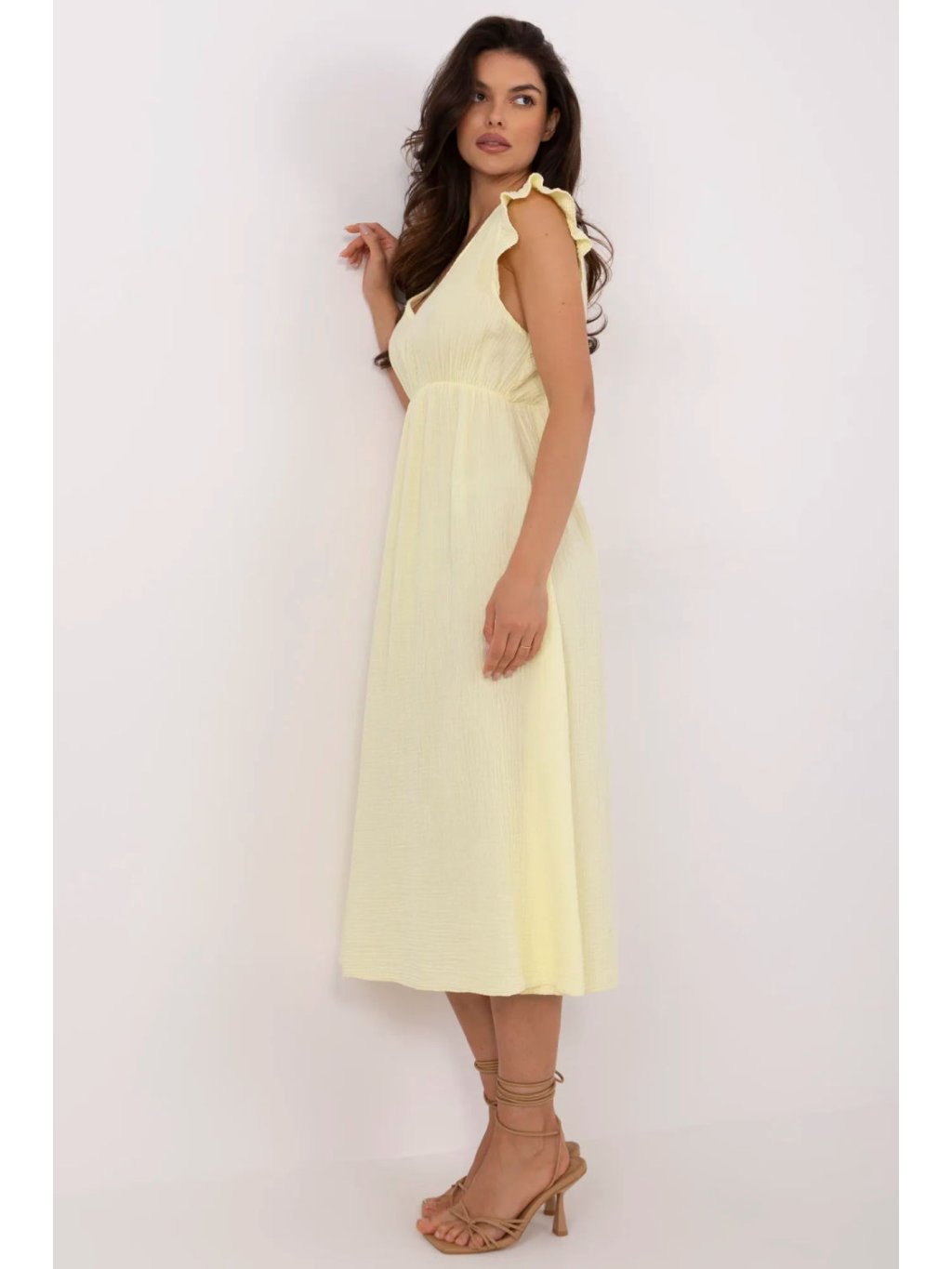 Tato roztomilá mušelínová šaty jsou kvintesencí letního stylu, lehké, vzdušné a neuvěřitelně ženské. Vyrobené z vysoce kvalitní bavlny, okouzlují měkkostí a prodyšností, díky čemuž se skvěle hodí i pro horké dny. Rozkročený střih dodává postavě lehkost, zatímco midi délka spojuje pohodlí s elegancí. Krátké rukávy ve formě jemných volánů a srdcovitý výstřih zdůrazňují subtilní, dívčí charakter šatů. Dalším bonusem je efektní šněrování na zádech, které nejen umožňuje lépe přizpůsobit šaty postavě, ale také představuje stylový akcent. Hladký materiál a klasický střih z ní dělají skvělou volbu jak pro každodenní nošení, tak i pro letní výlety.