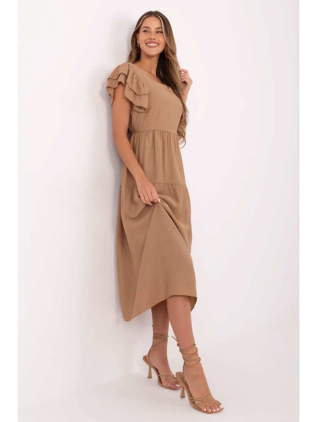 Elegantní a ženské letní šaty s rozkročeným střihem jsou skvělým návrhem na každodenní nošení i do práce. Vyrobené z lehké a prodyšné směsi viskózy a nylonu poskytují pohodlí i v nejteplejších dnech. Model midi délky krásně padne na siluetu a pásek umožňuje jemné zdůraznění pasu. Hladký materiál dodává šatům univerzální elegantní charakter, díky čemuž je snadno kombinovat s různými stylizacemi. Krátký rukáv ve formě volánků dodává lehkost a romantický půvab, zatímco výstřih do V opticky prodlužuje krk a dodává ženský šarm. Šaty se zapínají na knoflíky vzadu, což je stylový detail a usnadňuje oblékání. Ideální volba pro ženy, které si cení pohodlí, eleganci a funkčnost, jak při hektickém denním běhu, tak i během klidných letních dní.