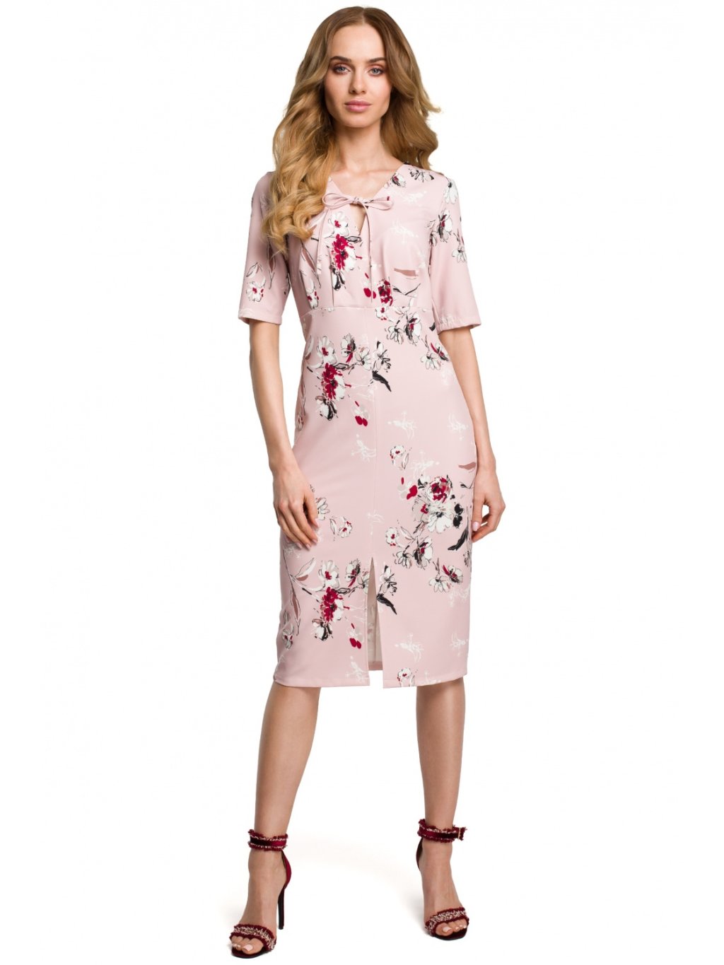 Klasický střih s půvabnými detaily: srdíčkový výstřih se zavazováním a vždy módní květinový potisk. Nezbytný doplněk vašeho jarního a letního šatníku. Šaty jsou bez podšívky a zapínají se na skrytý zip.