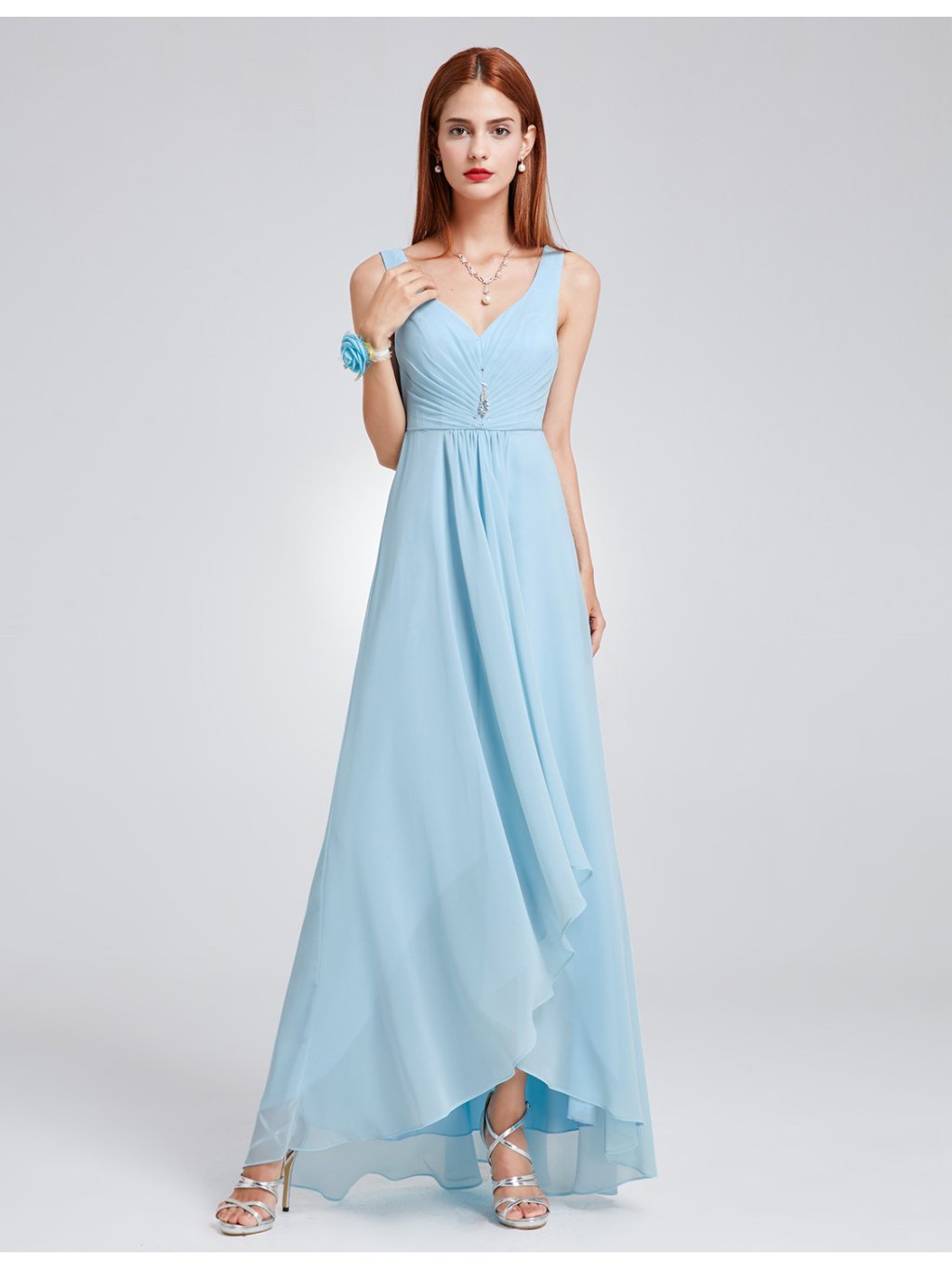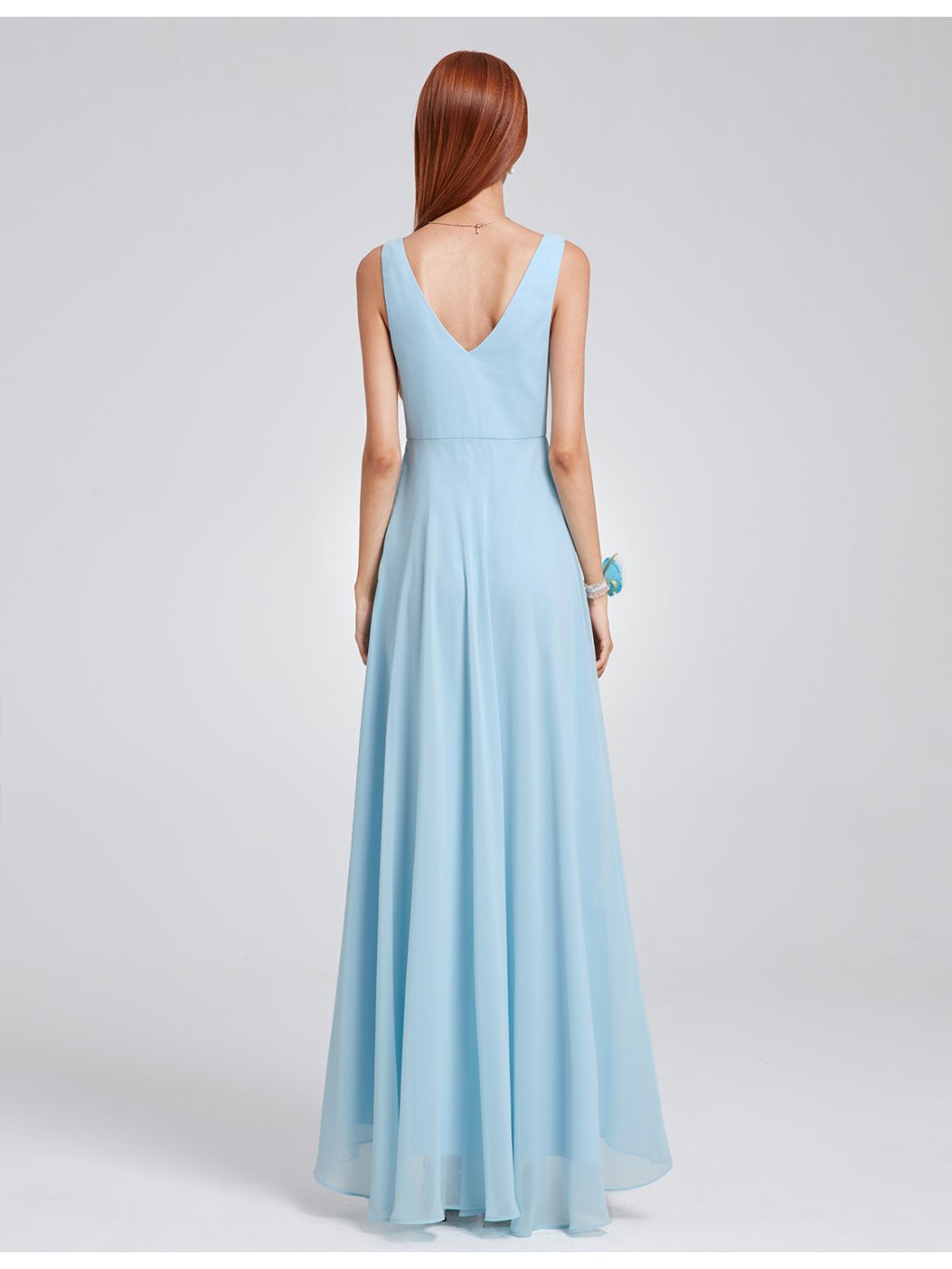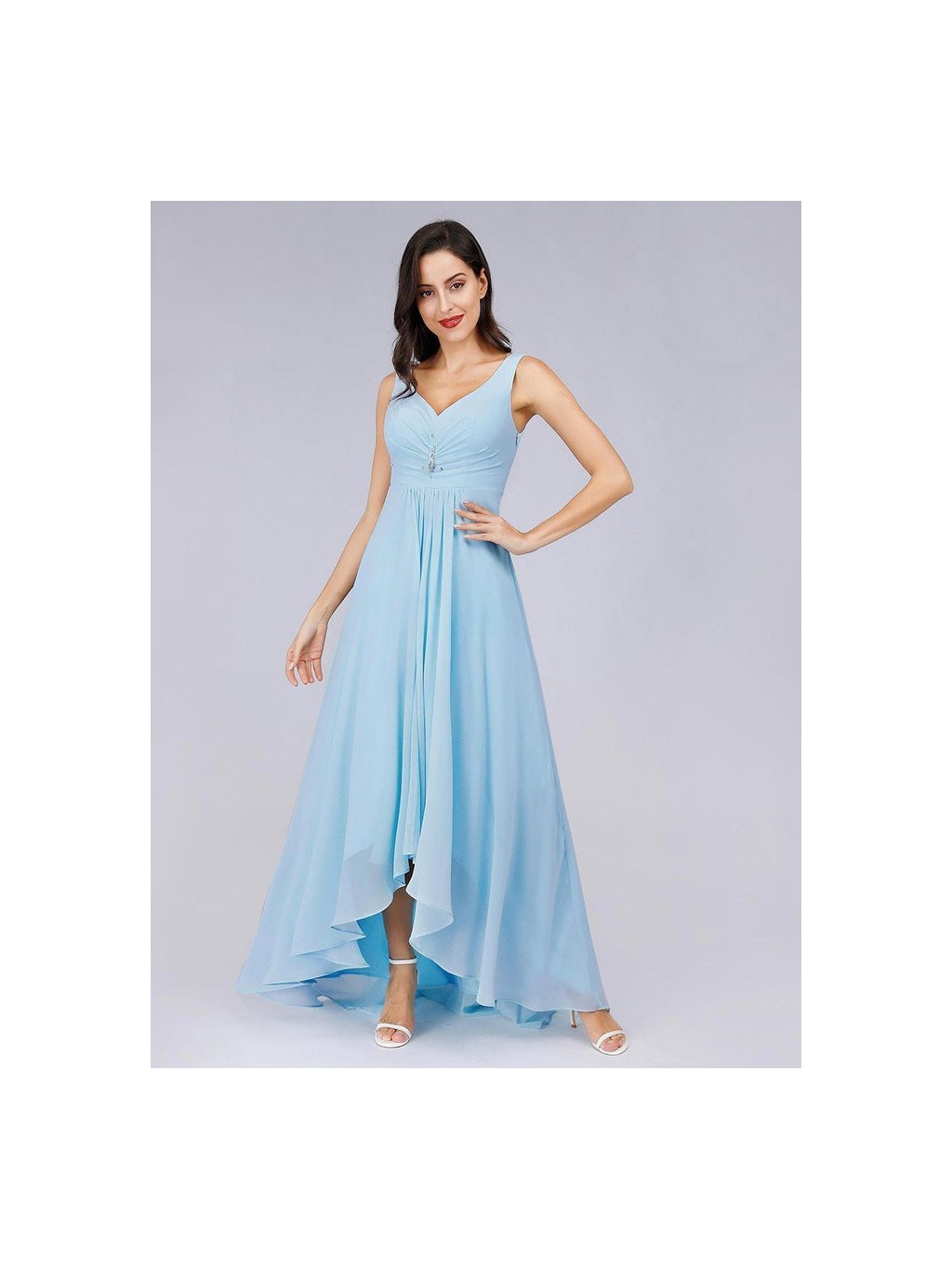 Světle modré šifonové šaty bez rukávů, vloženy vycpávky, lze nosit bez podprsenky. Vhodné do tanečních.