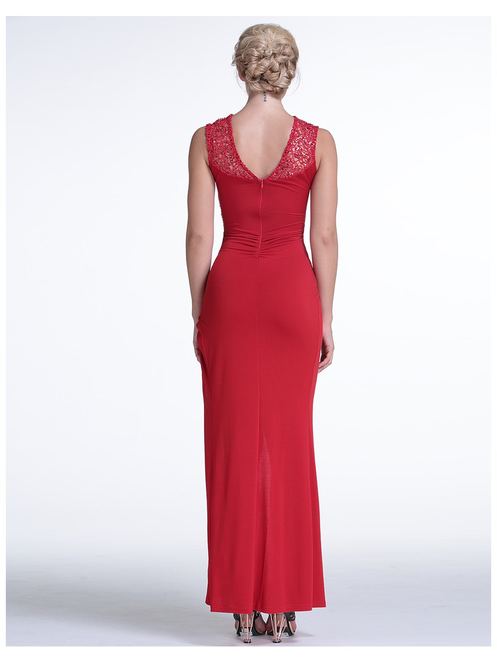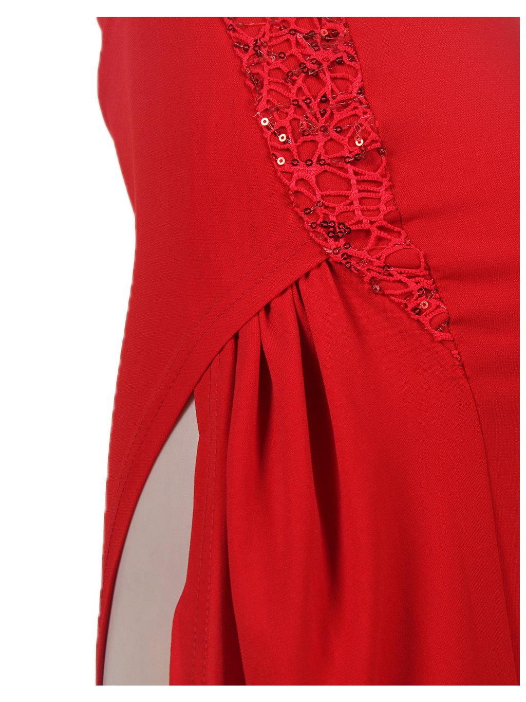 Dámské šaty dlouhé červené bez rukávku, velmi příjemný chladivý materiál. Vrchní díl je zdobený krajkou s flitry a velmi krásně řešenými zády.