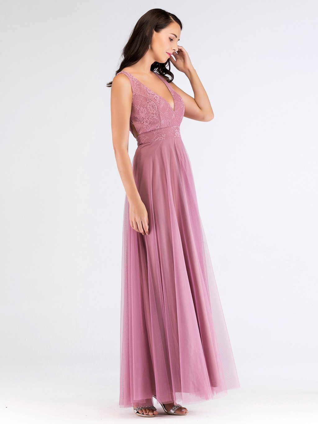 Elegantní dlouhé šaty Ever Pretty. šaty jsou na široká ramínka, na prsou mají hluboký véčkový výstříh, na zádech hluboký výstřih s křížením. Vrchní díl je zdobený luxusní krajkou. Šatičky mají skrytý zip na zádech a jsou bez polstrování.