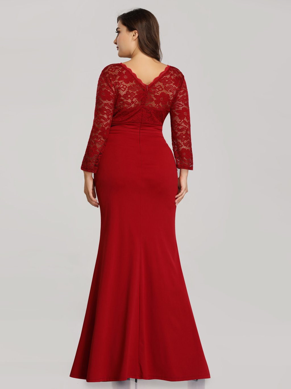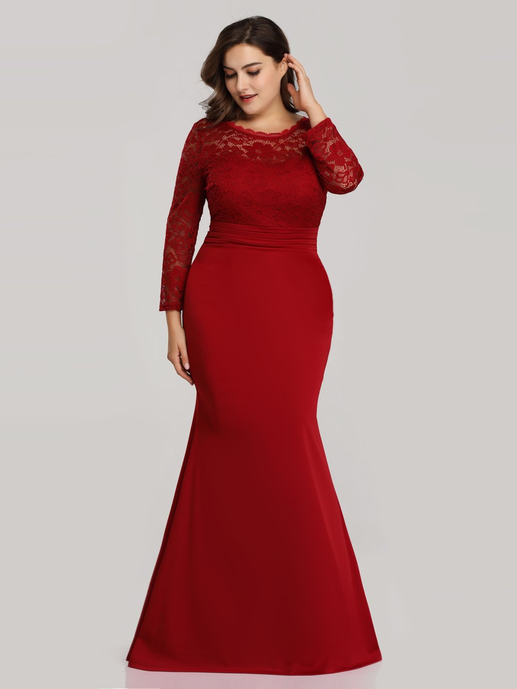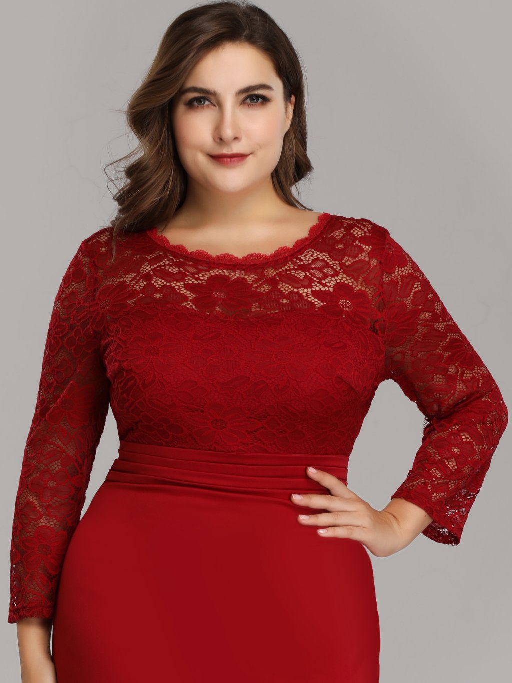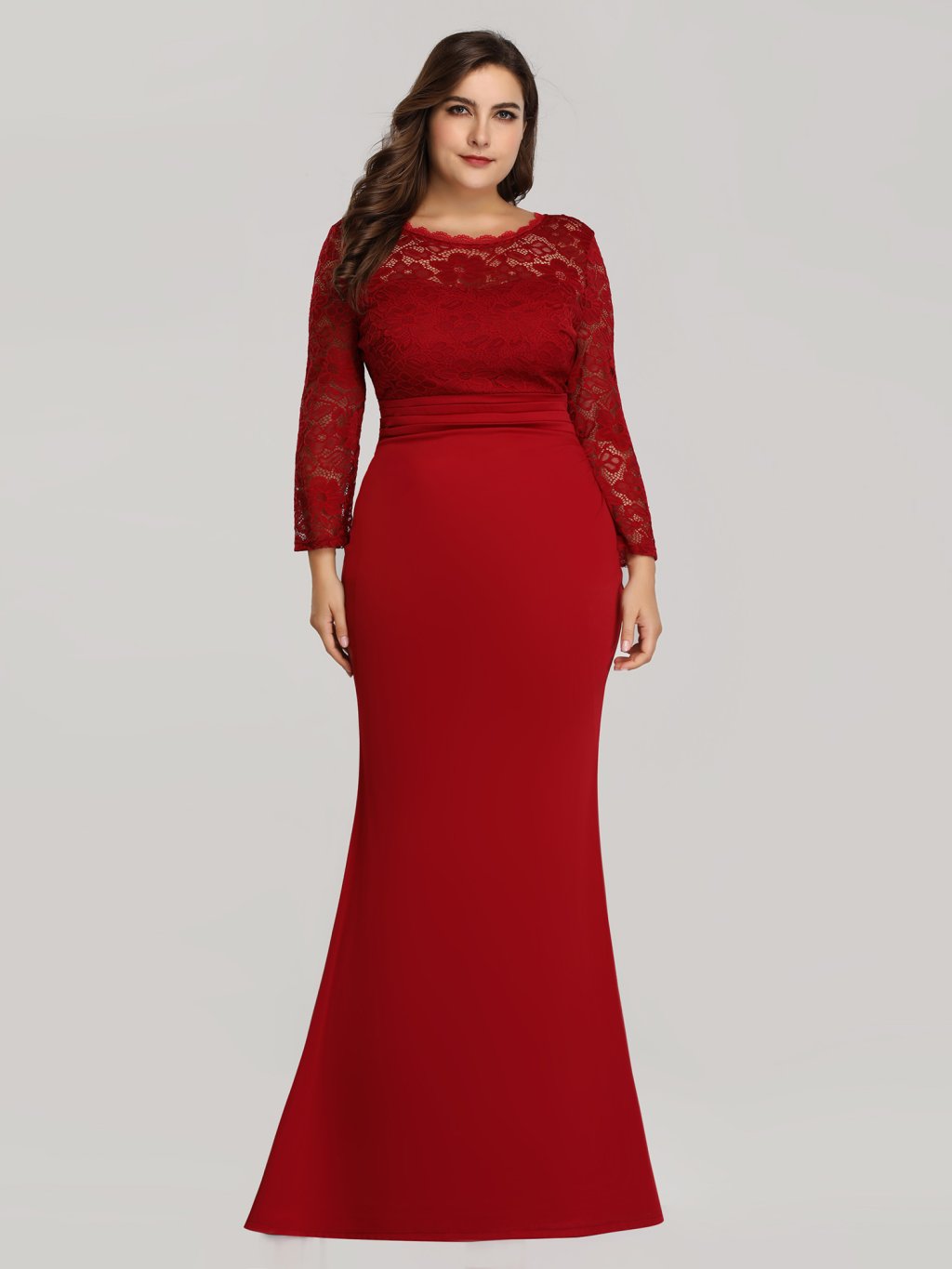 Luxusní červené šaty Ever Pretty. Šaty mají dlouhý. Vrchní díl je zdobený krajkou. Mají kulatý výstřih.