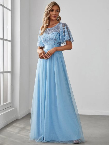Společenské elegantní světle modré šaty s kulatým vystřihem a výšivkou