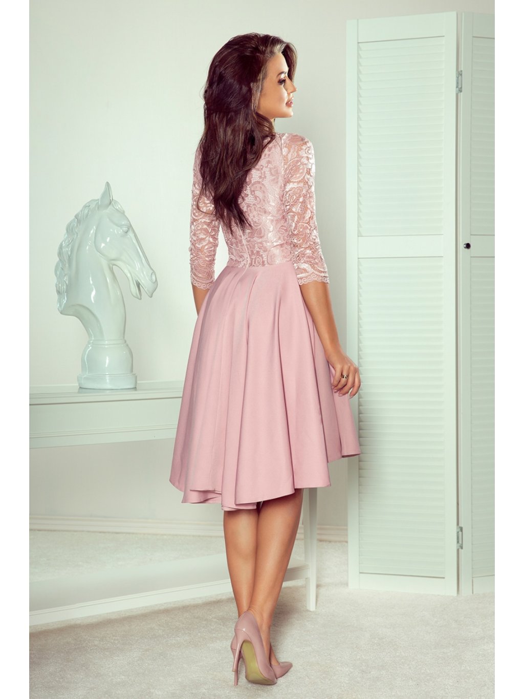 Asymetrické exkluzivní šaty s delšími zády, 3/4 rukávy, výstřihem a krajkou. Sukně s delším zadním dílem bude ideální pro tanec. Barva - pudrově růžová. Vyrobeno v Polsku. Značka numoco.