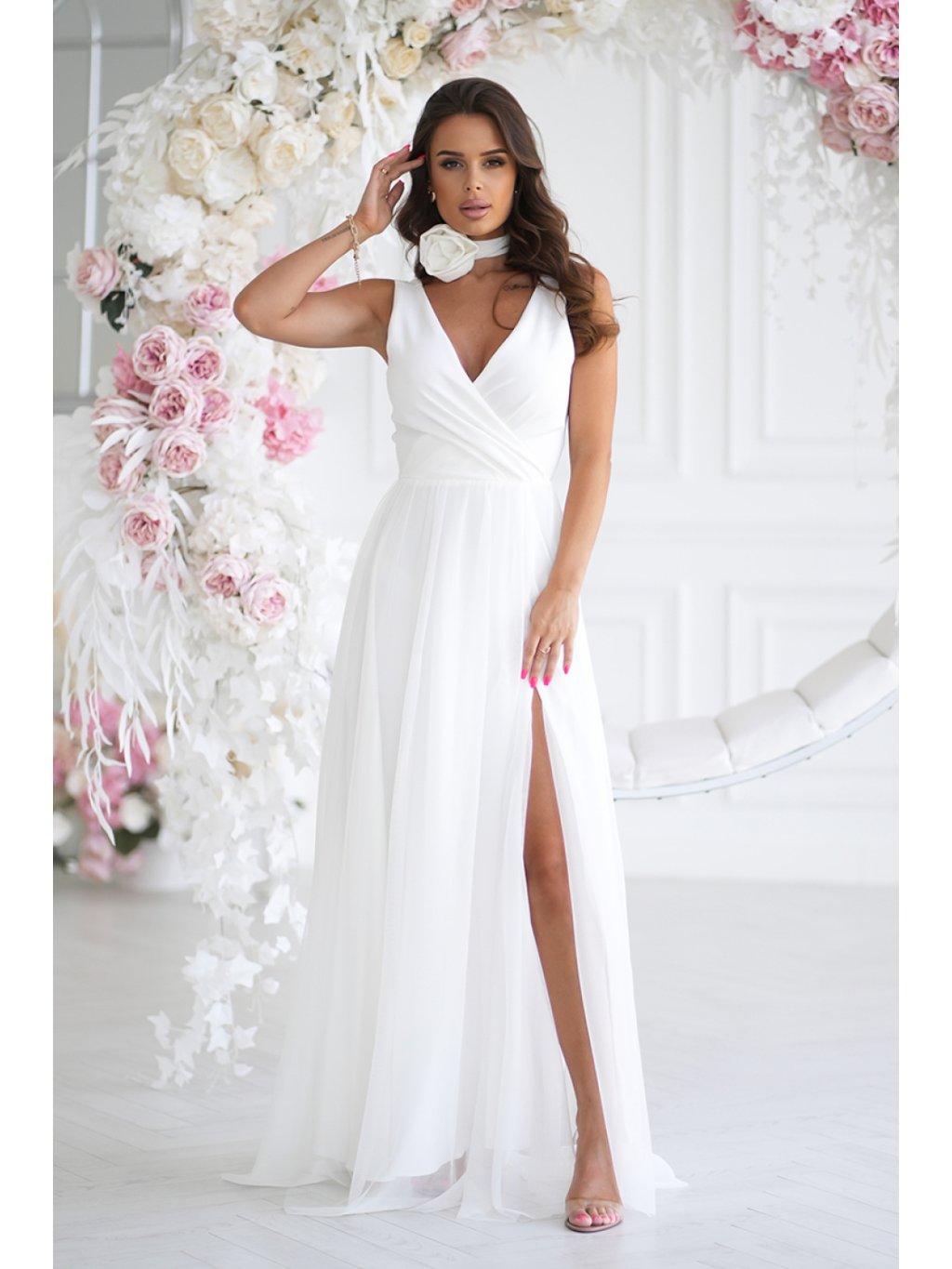 Krásné, dlouhé šaty, které ohromí svým neobvyklým střihem. Vyrobené z lehké látky, dokonale zdůrazňují siluetu. Horní část šatů má jemný výstřih, a dvouvrstvý spodek s výstřihem na noze přidává kreaci šarmu. K šatům je přiložen pás s růží, který lze navinout na různé způsoby, jak na krk, tak na pas, což umožňuje individuální přizpůsobení stylu.