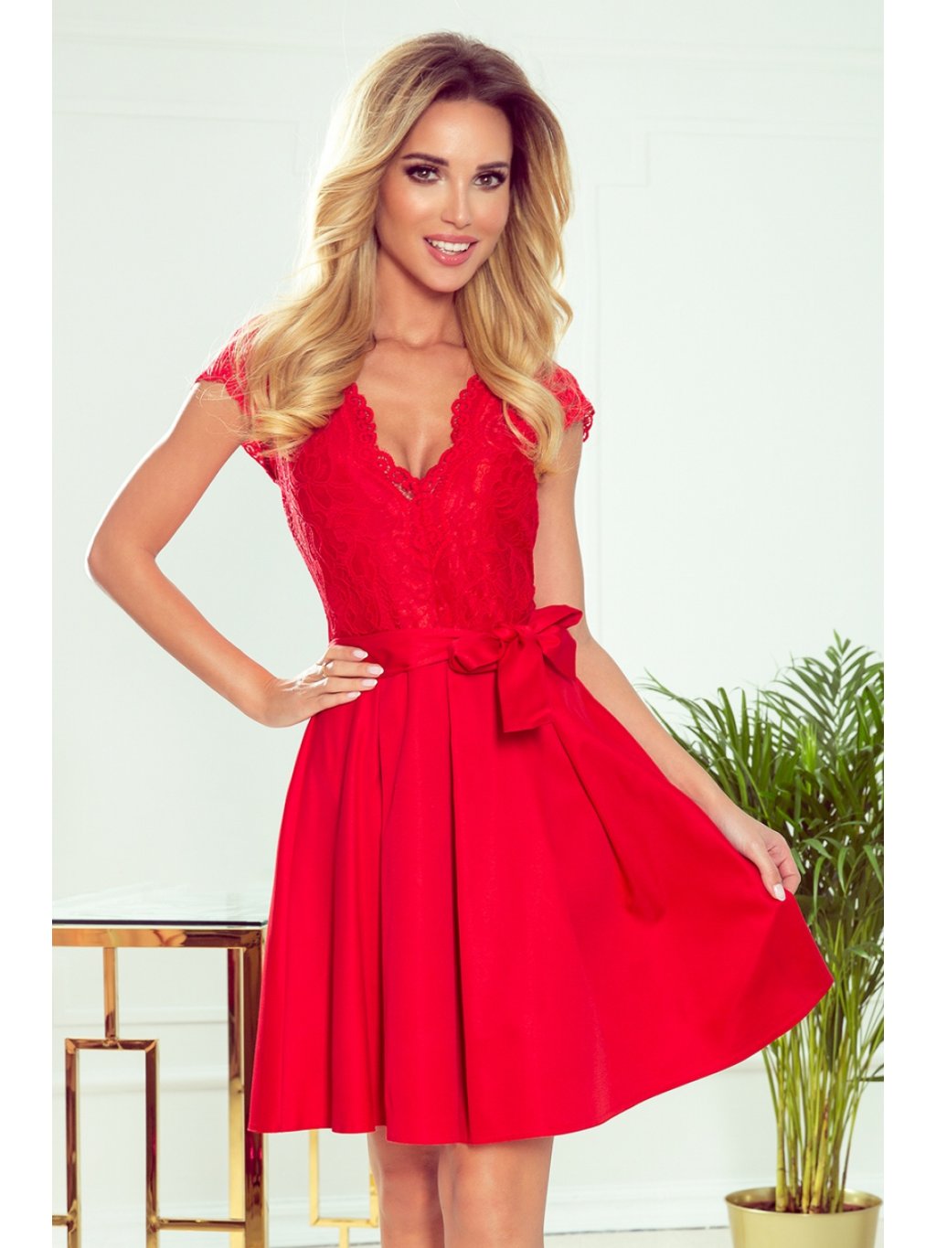 Rozšířené šaty s volánky, výstřihem a krajkou. Šaty v červené barvě. Klasické a elegantní. Vyrobeno v Polsku. Vyrobeno společností numoco.