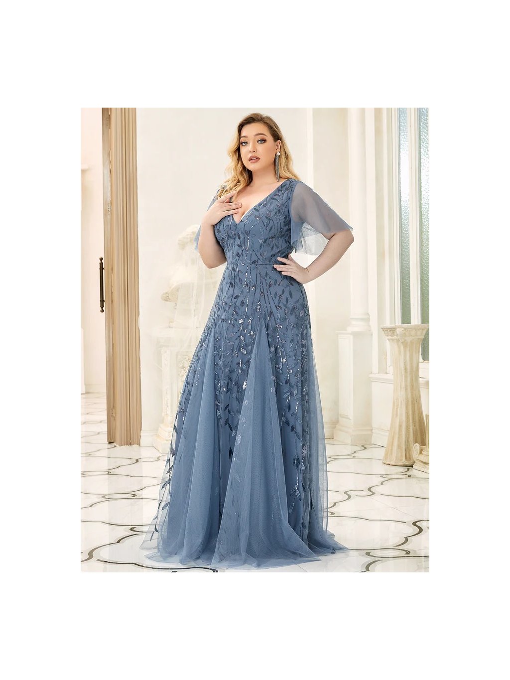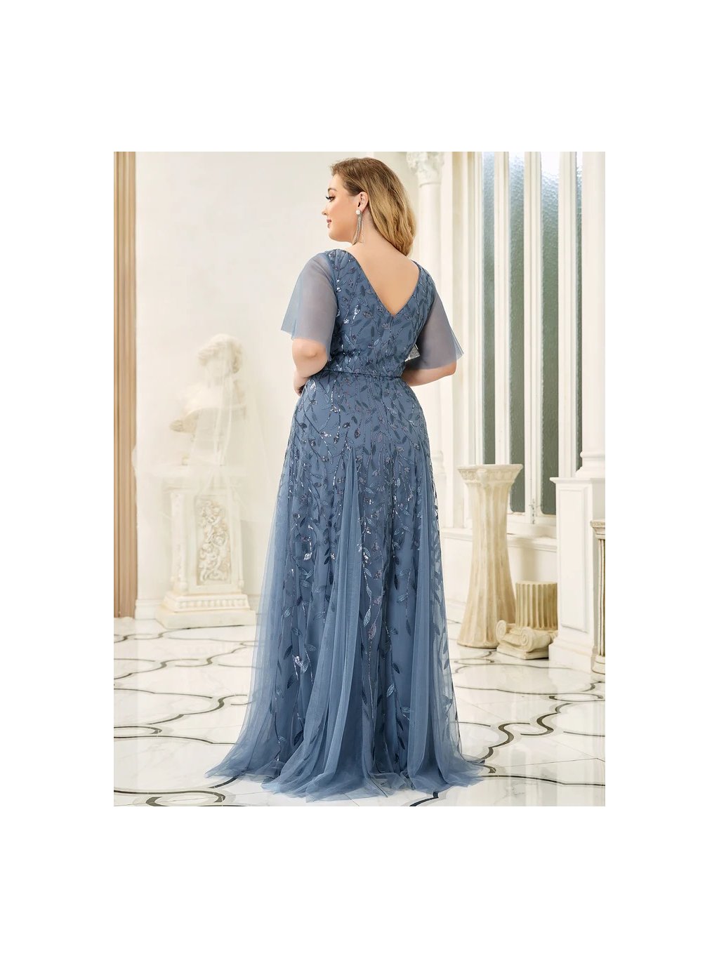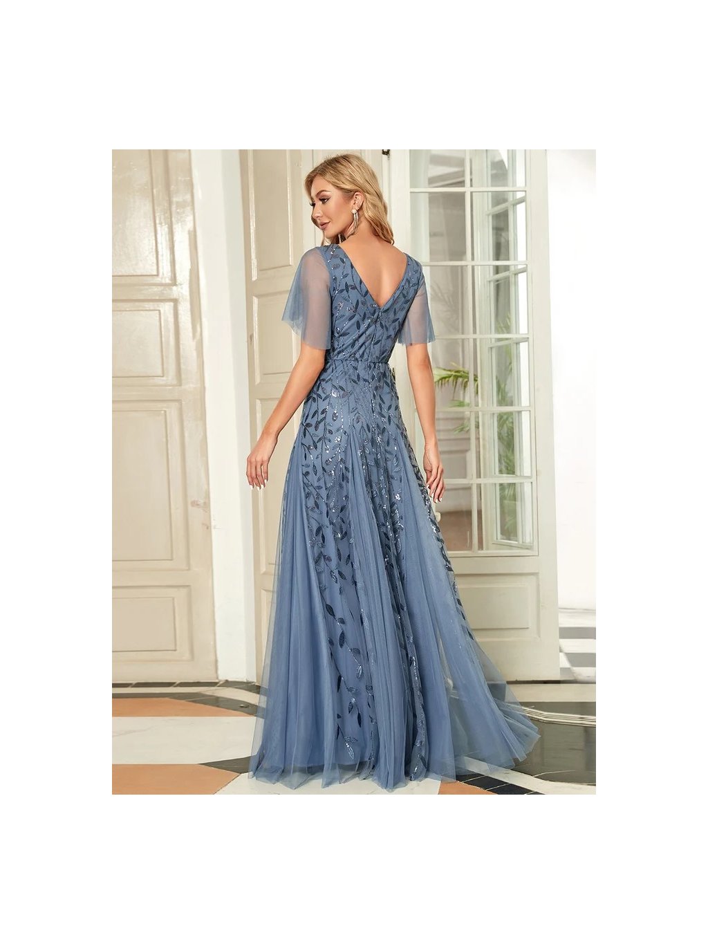 Luxusní šaty v barvě světle modré. Vhodné do společnosti na ples i do tanečních. Šaty jsou krásného střihu s rukávy, bohatě zdobené flitry ve tvaru lístků. Vrchní díl je vyšívaný a zdobený flitry. Na prsou i zádech mají véčkový výstřih. Šatičky mají skrytý zip na zádech.