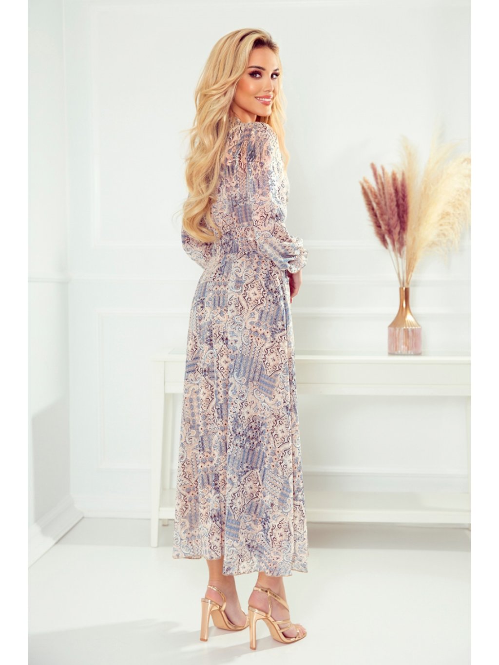 Šifonové midi šaty s výstřihem a dlouhými rukávy. Šaty z béžovomodré vzorované látky. Polská produkce. Značka Numoco.