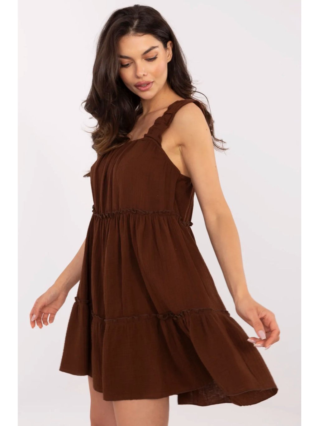 Jemný a prodyšný letní šaty šité z přírodního, dýchajícího mušelínové bavlny, ideální na teplé, slunečné dny. Hladká látka a rozšířený střih vytvářejí lehký, volný celek, který krásně padne na postavě. Model před kolena, s širokými ramínky a moderním čtvercovým výstřihem, který jemně zdůrazňuje linii ramen a krku. Šaty se oblékají přes hlavu, zaručují pohodlí a komfort při nošení. Dalším prvkem je volán na spodku, který dodává celku dívčí půvab a jemný pohyb při chůzi. Skvělé na každodenní nošení při procházkách, na pláži, nákupy nebo letní setkání.