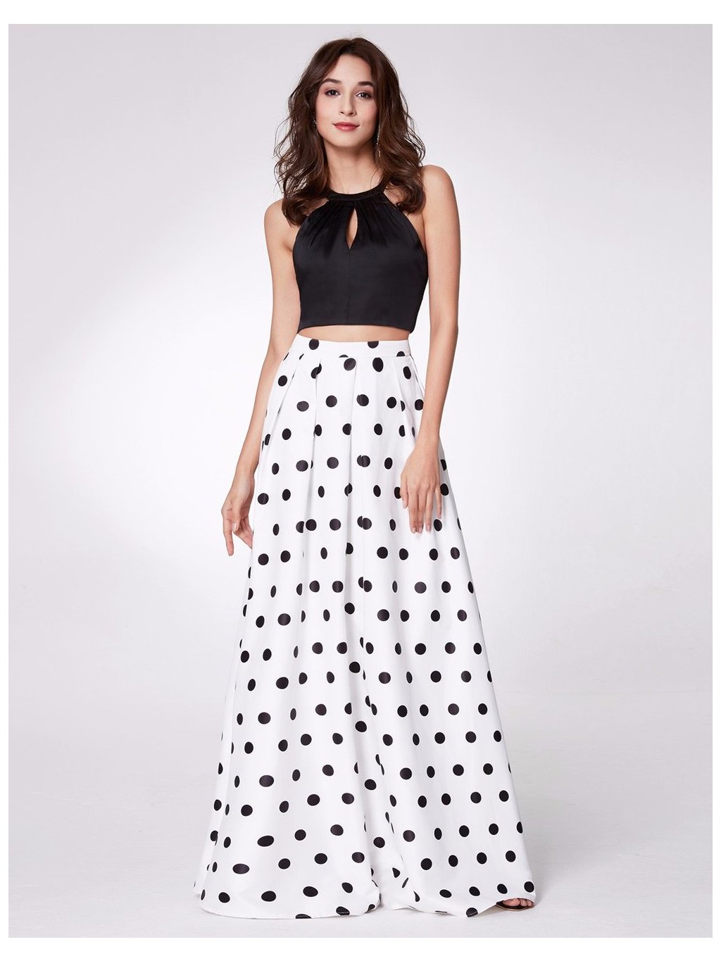 Krásný model Ever Pretty. Dlouhá sukně bílá s černými puntíky a černý top.