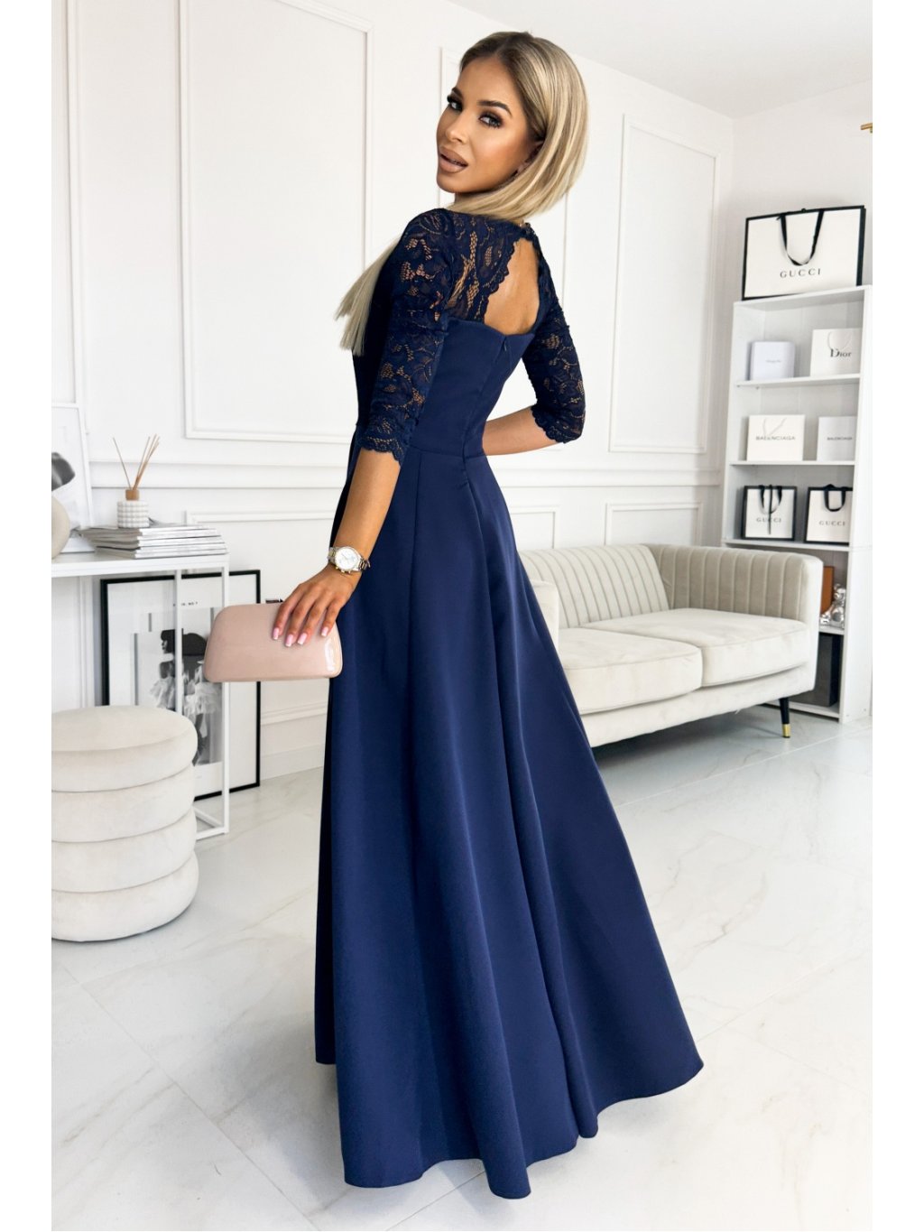 Elegantní dlouhé krajkové šaty se srdíčkovým výstřihem. Krásně tvarovaný výstřih a rozparek na sukni vytvářejí neobvyklou kreaci v tmavě modré barvě. Polská výroba. Značka Numoco.