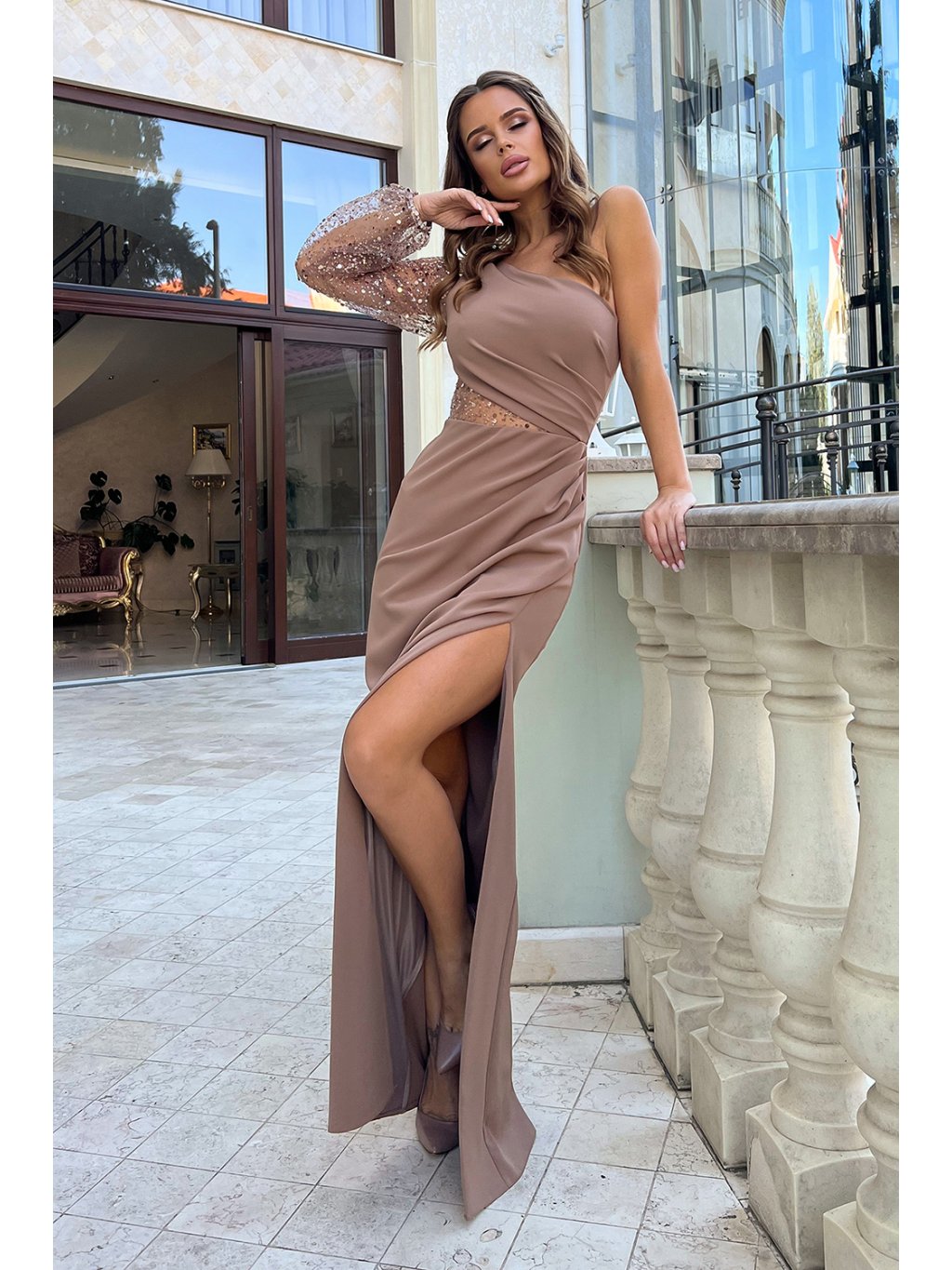 Model s krásnými flitrovými rukávy na jedno rameno. Asymetrický top, rovněž s flitrovou vsadkou. Spodní část kreace je hladká, řasená, s nápadným rozparkem na nohavici. Šaty se zapínají na skrytý zip a mají podšívku. Mimořádně elegantní, stylové šaty ideální na plesy, maturitní plesy a svatby.