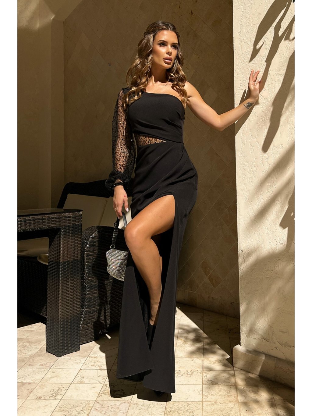 Model s krásnými flitrovými rukávy na jedno rameno. Asymetrický top, rovněž s flitrovou vsadkou. Spodní část kreace je hladká, řasená, s nápadným rozparkem na nohavici. Šaty se zapínají na skrytý zip a mají podšívku. Mimořádně elegantní, stylové šaty ideální na plesy, maturitní plesy a svatby.