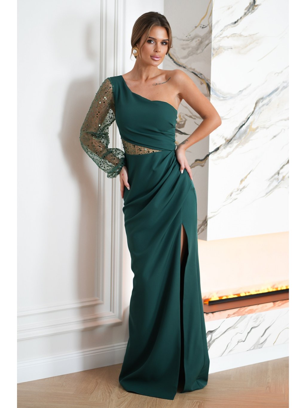 Model s krásnými flitrovými rukávy na jedno rameno. Asymetrický top, rovněž s flitrovou vsadkou. Spodní část kreace je hladká, řasená, s nápadným rozparkem na nohavici. Šaty se zapínají na skrytý zip a mají podšívku. Mimořádně elegantní, stylové šaty ideální na plesy, maturitní plesy a svatby.