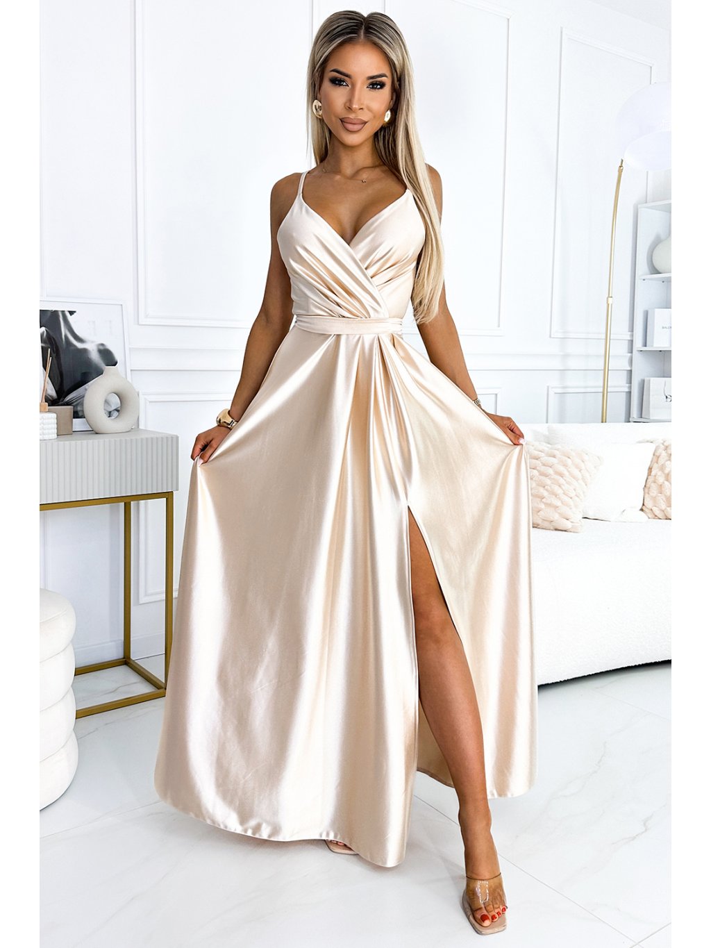 Elegantní maxi dlouhé saténové šaty s rozparkem na nohou a páskem. Krásně tvarovaný výstřih a rozparek na sukni vytvářejí neobvyklou kompozici. Vyrobeno z lesklého, hladkého, mírně elastického saténu v béžové barvě. Šaty ideální na svatbu, Silvestra, ples, karneval a jiné významnější příležitosti. Vyrobeno v Polsku. Značka Numoco.