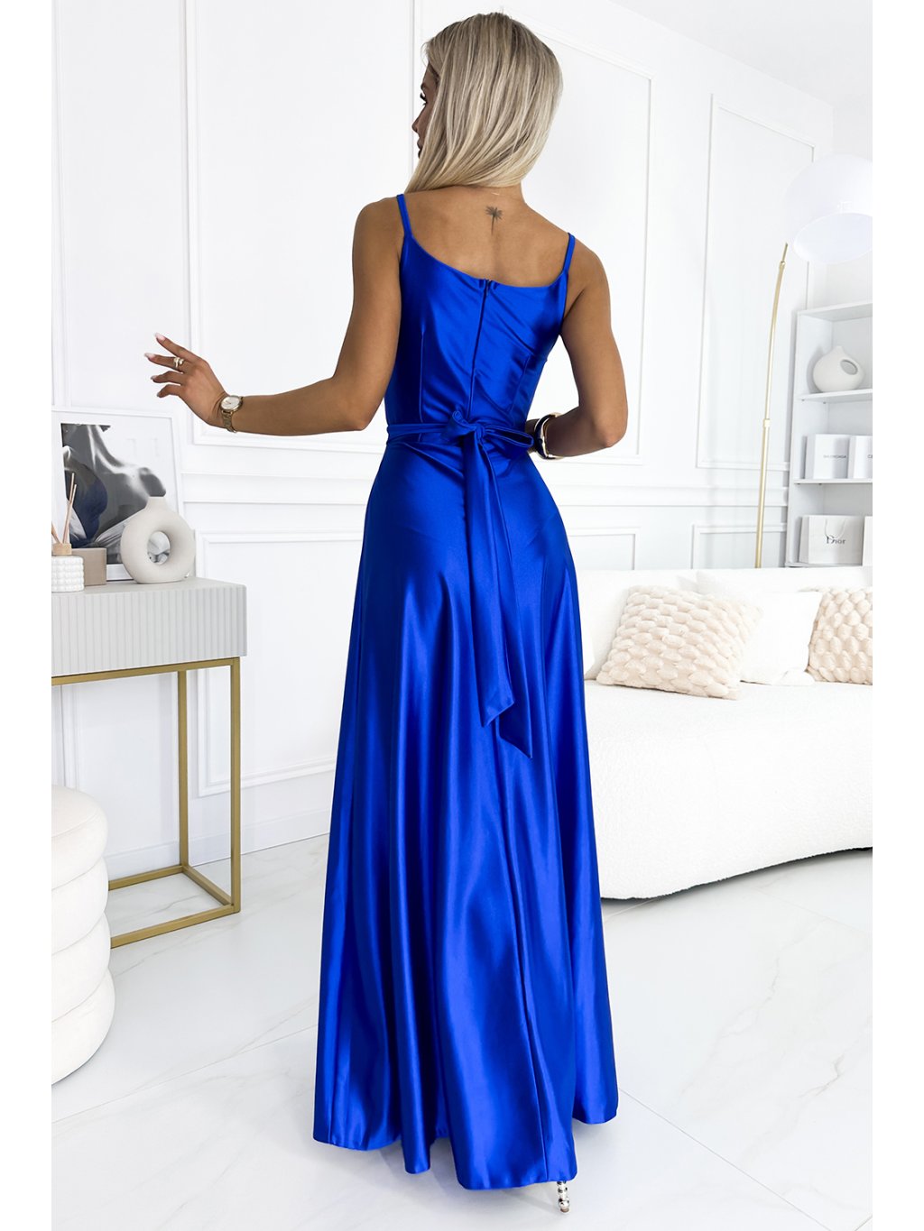 Juliet - elegantní maxi dlouhé saténové šaty s rozparkem na nohou a páskem. Krásně tvarovaný výstřih a rozparek na sukni vytvářejí neobvyklou kompozici. Vyrobeno z lesklého, hladkého, mírně elastického saténu v chrpové barvě. Šaty ideální na svatbu, Silvestra, ples, karneval a jiné významnější příležitosti. Polská výroba. Značka Numoco.Polyester 95 %