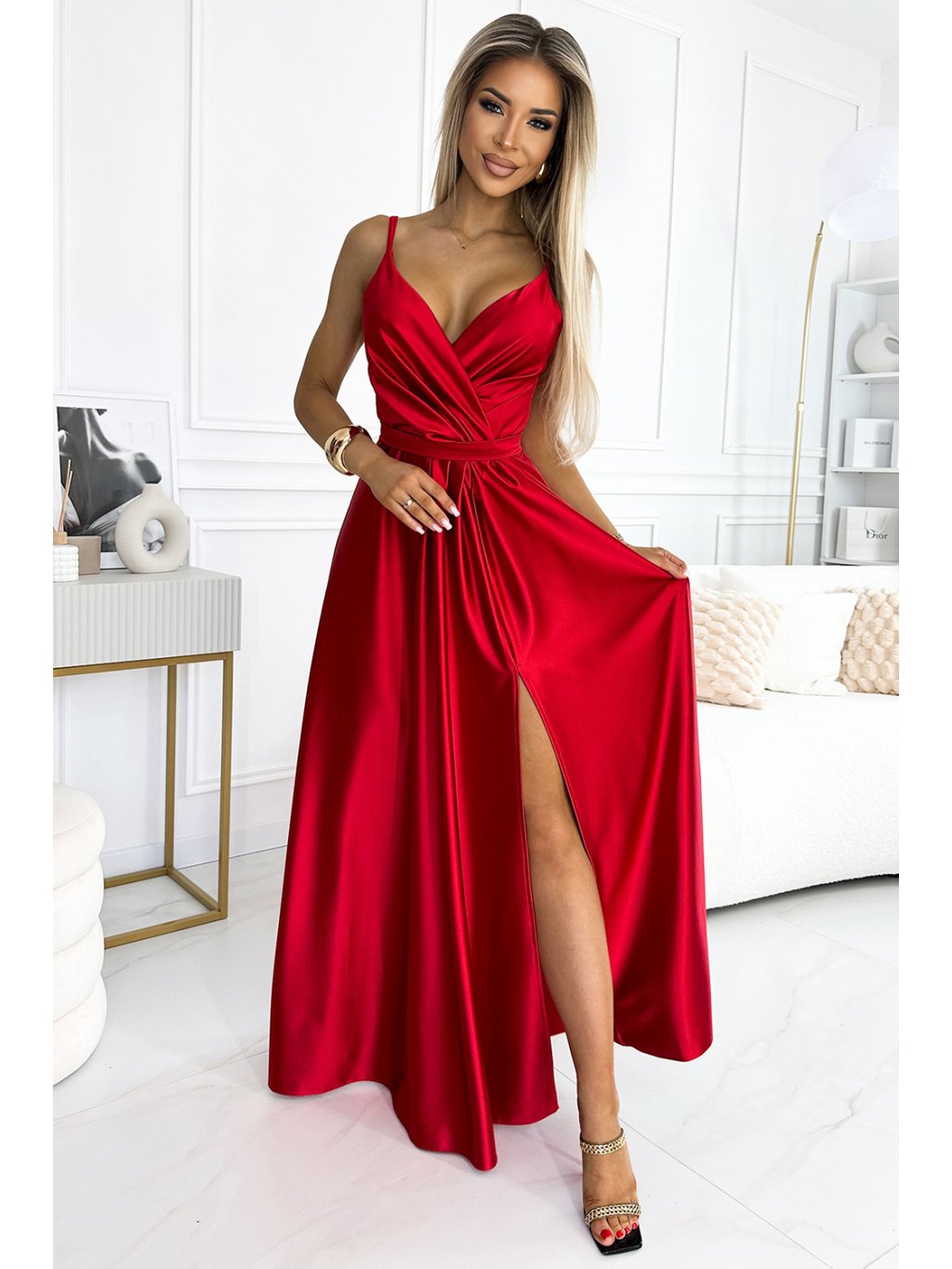 Elegantní maxi dlouhé saténové šaty s rozparkem na nohou a páskem. Krásně tvarovaný výstřih a rozparek na sukni vytvářejí neobvyklou kompozici. Jsou vyrobeny z lesklého, hladkého, mírně elastického saténu v červené barvě. Šaty ideální na svatbu, Silvestra, ples, karneval a jiné významnější příležitosti. Vyrobeno v Polsku. Značka Numoco.