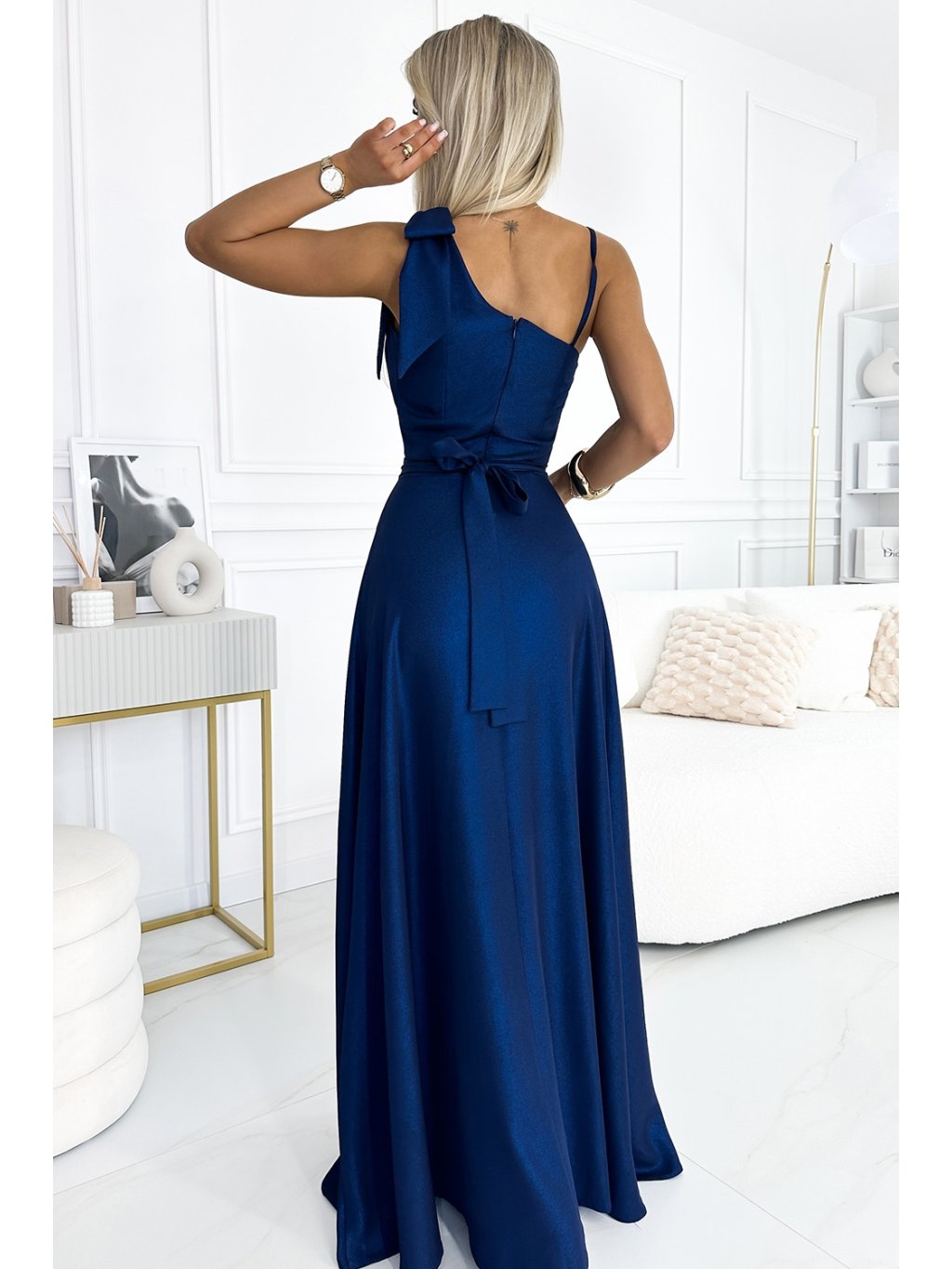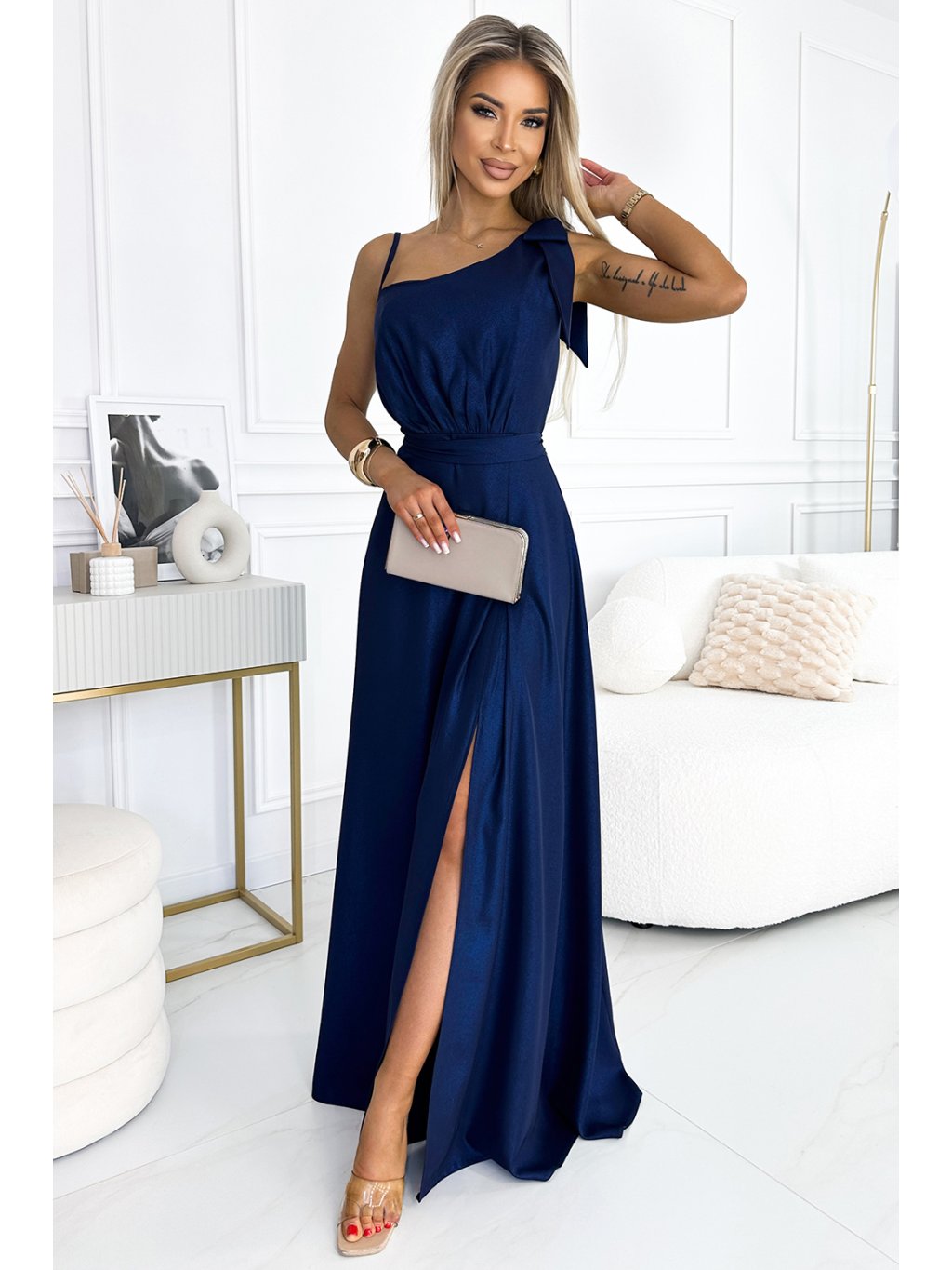 Elegantní dlouhé třpytivé šaty na jedno rameno s mašlí. Vyrobeno z brokátové tkaniny v tmavě modré barvě. Šaty ideální na svatby, Silvestra, plesy, karnevaly a jiné významné události. Vyrobeno v Polsku. Značka Numoco.