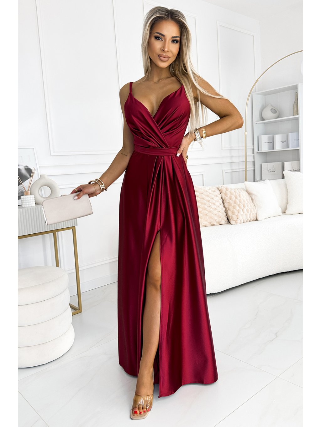 Elegantní maxi dlouhé saténové šaty s rozparkem na nohou a páskem. Krásně tvarovaný výstřih a rozparek na sukni vytvářejí neobvyklou kompozici. Vyrobeno z lesklého, hladkého, mírně elastického saténu ve vínové barvě. Šaty ideální na svatbu, Silvestra, ples, karneval a jiné významnější příležitosti. Vyrobeno v Polsku. Značka Numoco.