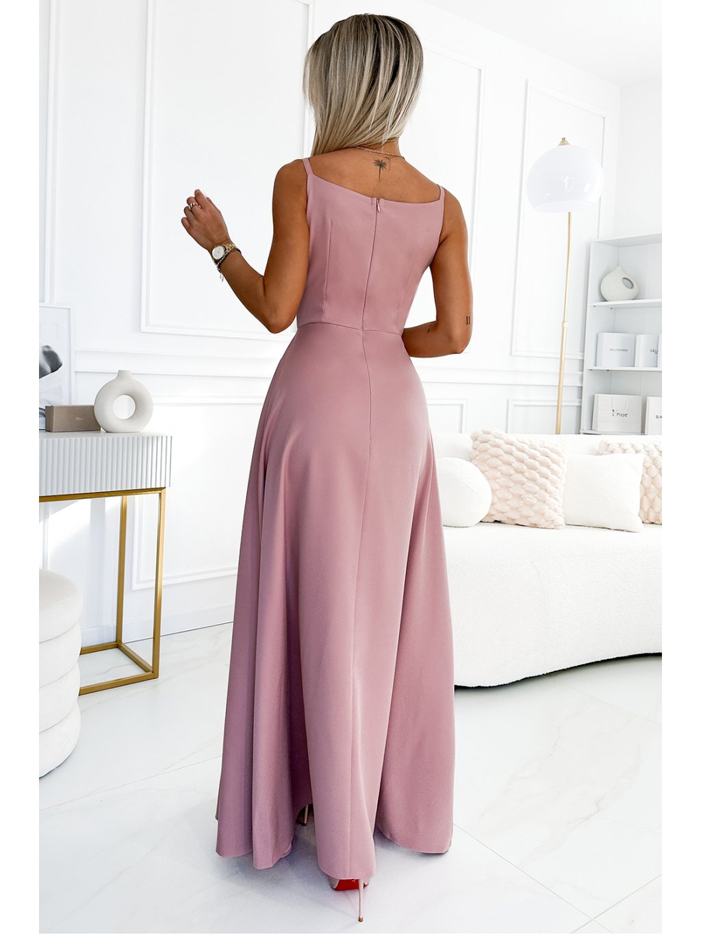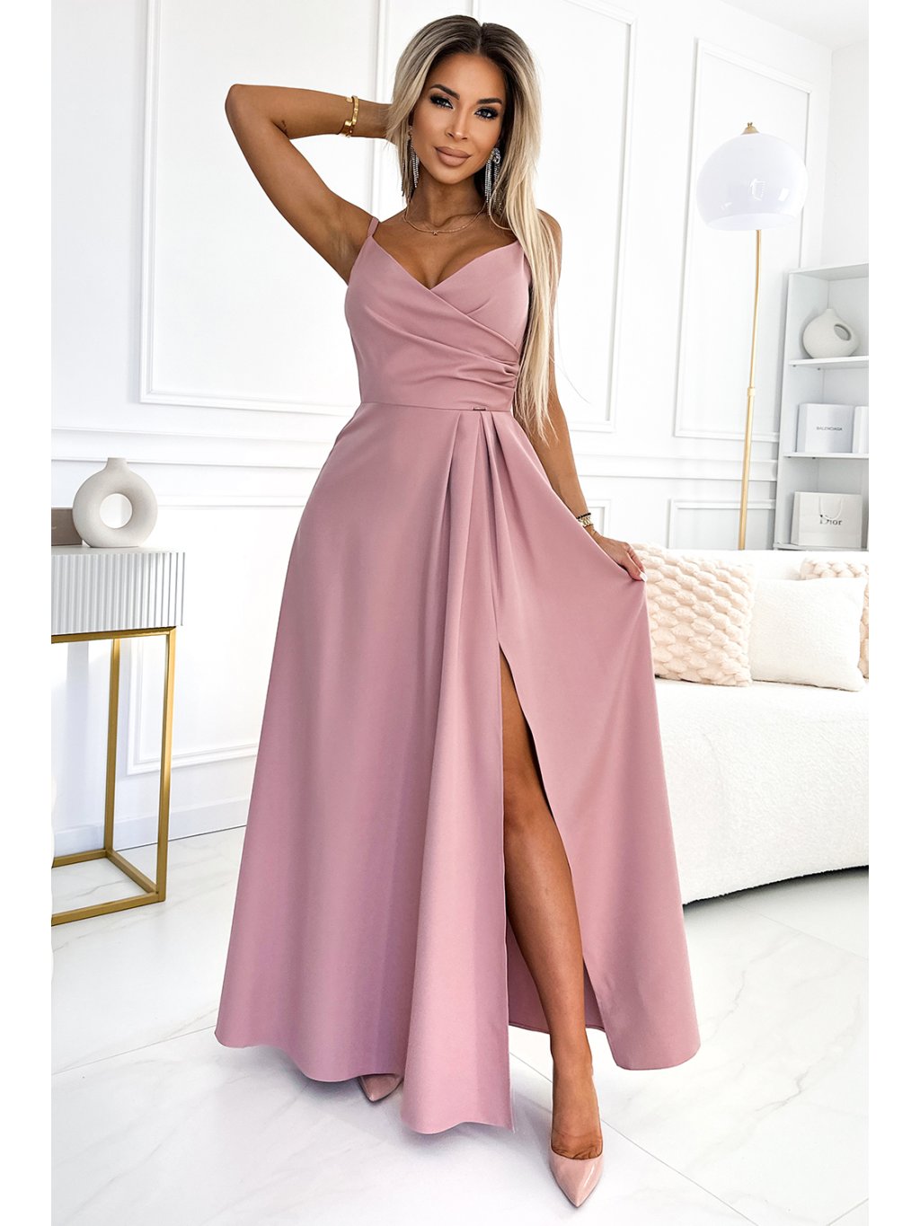 Elegantní maxi šaty na ramínka . Krásně tvarovaný výstřih a rozparek na sukni vytvářejí neobvyklou kompozici. Šaty v barvě špinavě růžové. Polská výroba. Značka Numoco.