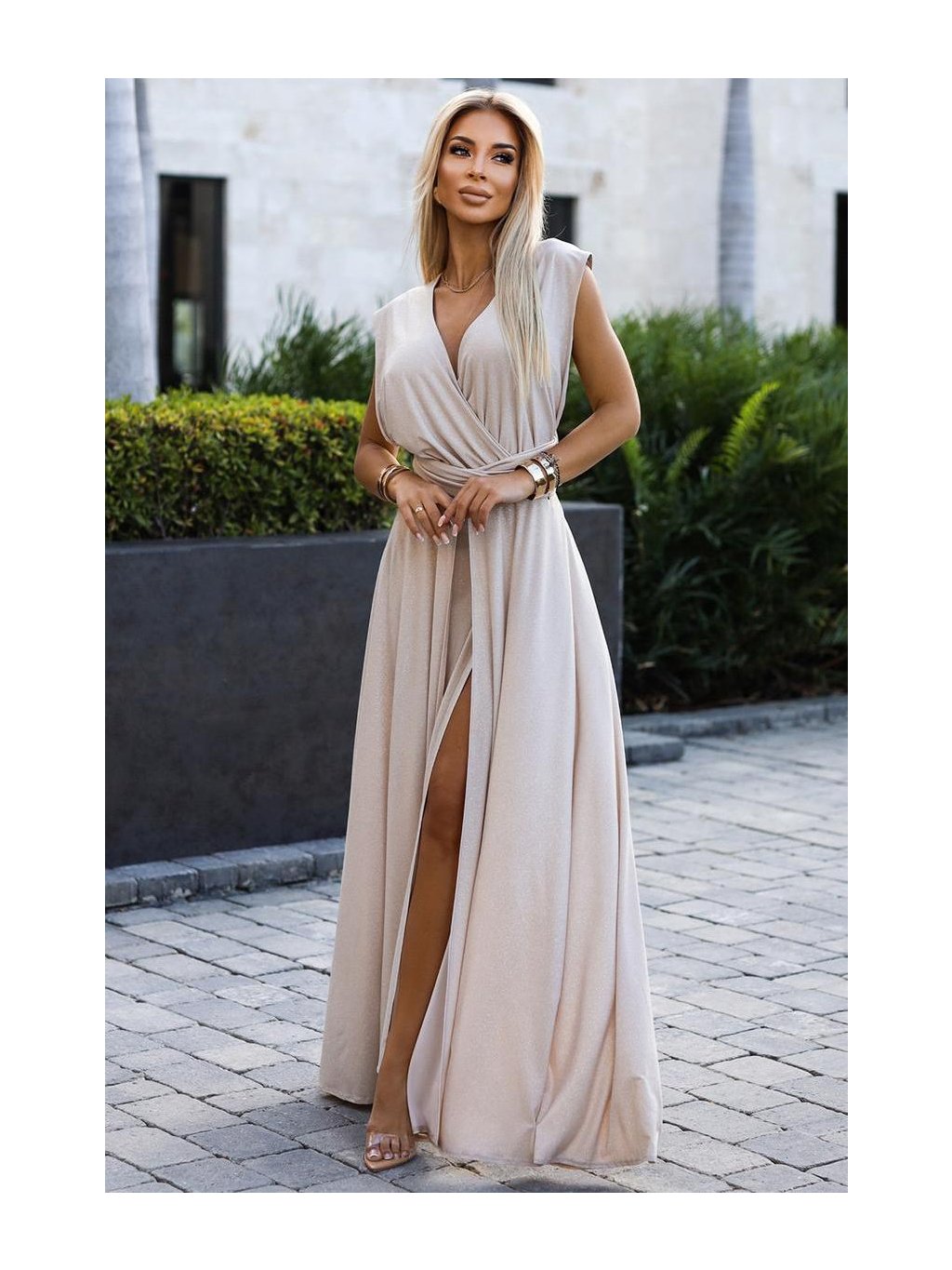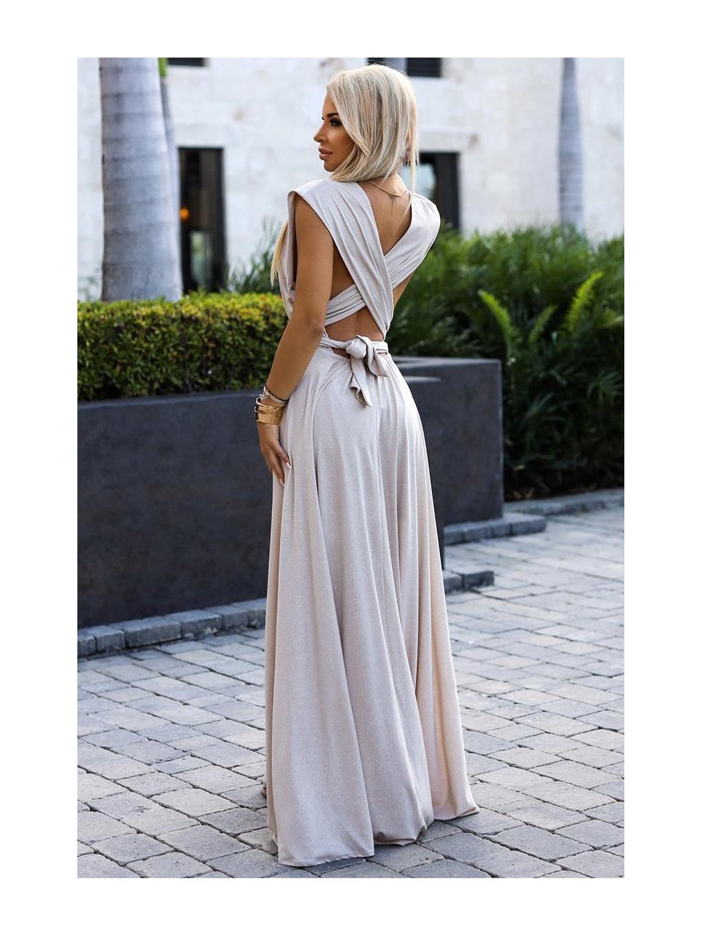 Elegantní maxi dlouhé šaty, které lze uvázat mnoha způsoby. Jsou vyrobeny z béžové elastické látky s brokátem. Vyrobeno v Polsku. Značka Numoco.