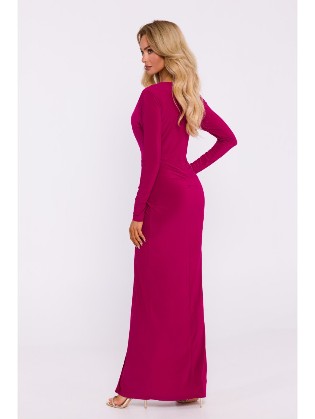 Elegantní společenské šaty z elastického úpletu, který zajišťuje pohodlí při nošení a dokonale přiléhá k postavě. Model v maxi délce s hlubokým výstřihem do V zdůrazňujícím linii poprsí. Střih je přiléhavý, s ozdobným uzlem na přední straně, který dodává stylingu jedinečný charakter, a vysokým rozparkem, který decentně odhaluje nohu. Šaty mají dlouhé rukávy a na zádech jsou modelující záhyby, které opticky zeštíhlují siluetu. Diskrétní zapínání zajišťuje skrytý zip na boku. Šaty nemají podšívku, což zdůrazňuje jejich lehkost. Výrobek navržen a ušit v Polsku.