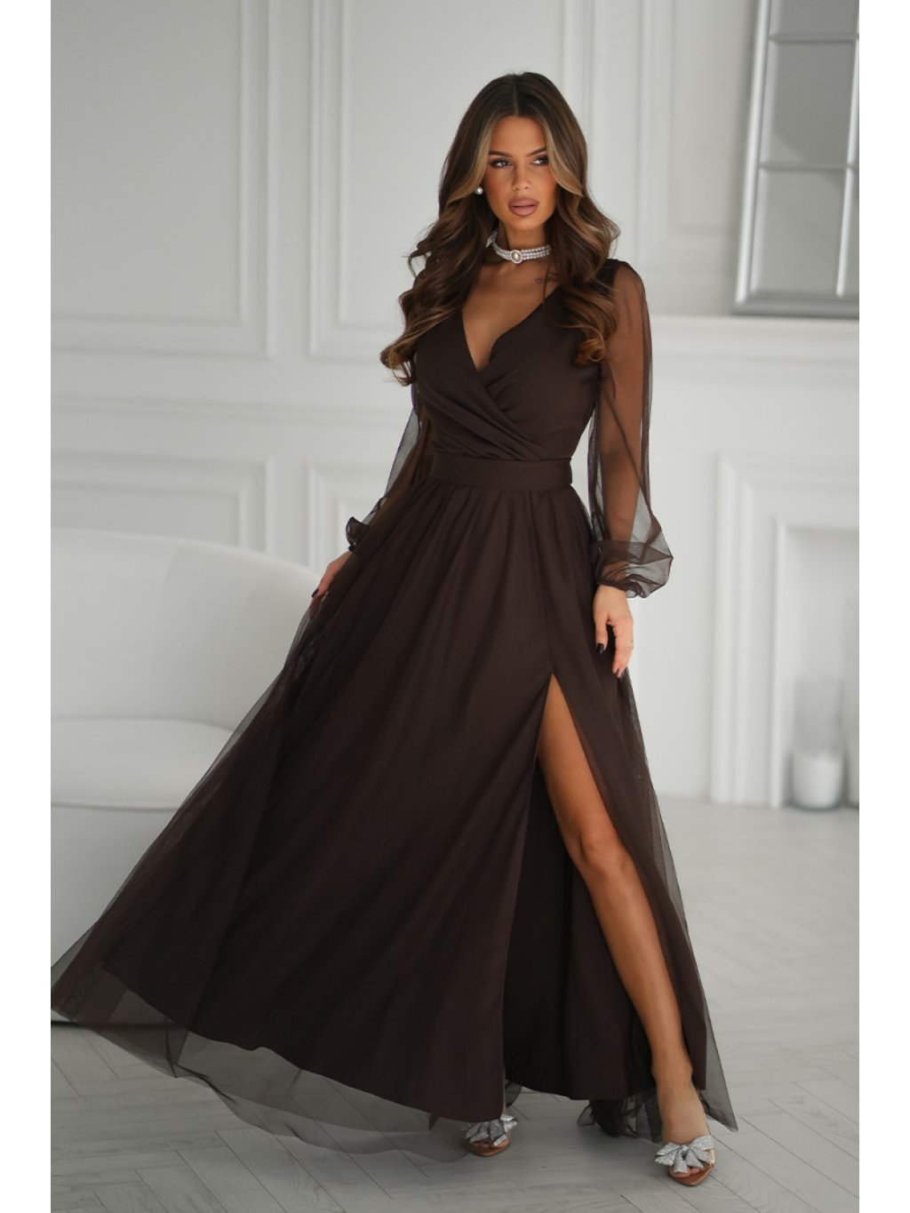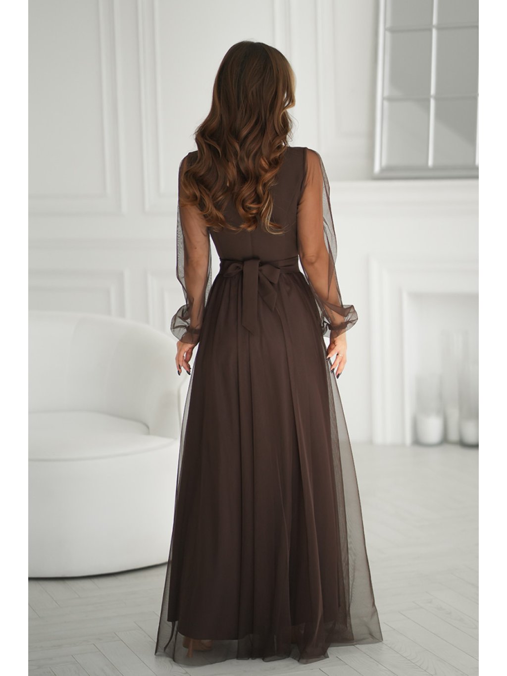 Elegantní šaty s rukávy hnědé 220610 Bicotone
