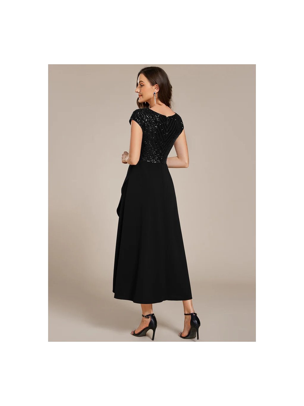 Luxusní černé šaty Ever Pretty. Šaty mají krátké rukávky, na prsou mají velký výstřih. Vrchní díl je zdobený flitry. Sukně je bohatá, tylová.