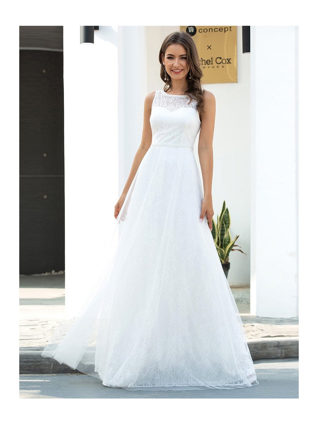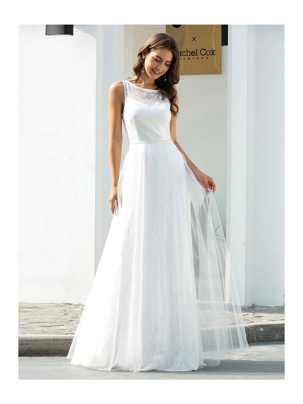 Luxusní bílé dlouhé šaty Ever Pretty. Šatičky mají na prsou i zádech kulatý výstřih. Výstřih je lemovaný perličkami. Šaty mají v pase pásek stejného stylu - zdobený perličkami. Vrchní část šatů je tylová, spodní část je celá zdobená jemnou výšivkou. Šaty mají na zádech skrytý zip.