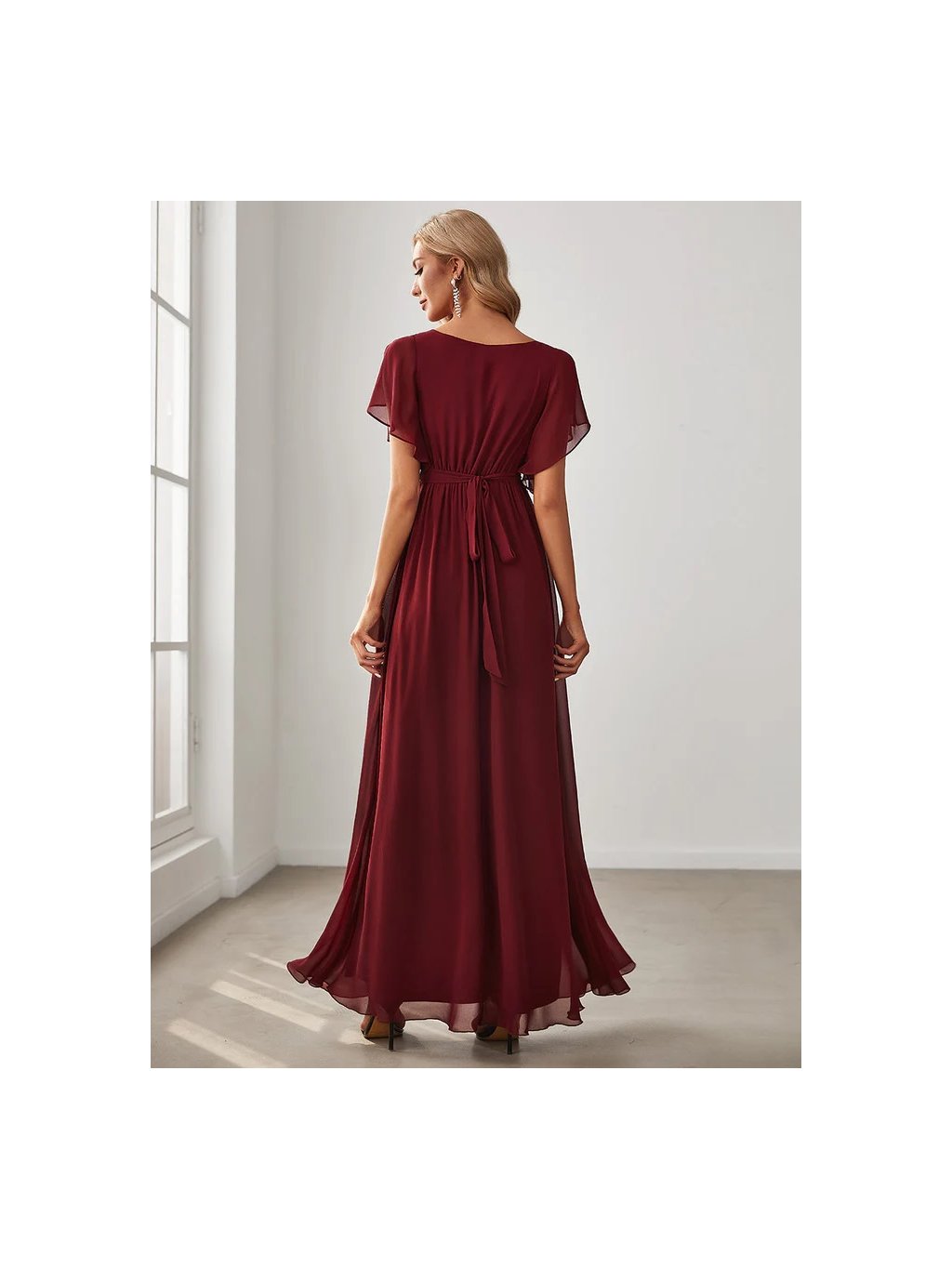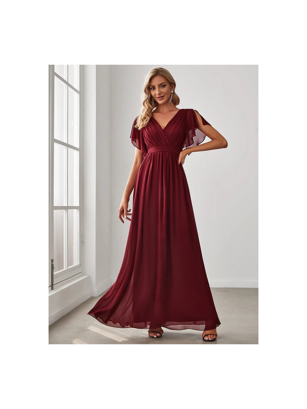 Bordové šifónové šaty s rukávky. Véčkový výstřih v předu, v zadu kulaty.Pásek jde v zadu stáhnout mašlí Tento model je naprosto dokonalý ve své jednoduchosti. Sedí většině postav a velikostí.
