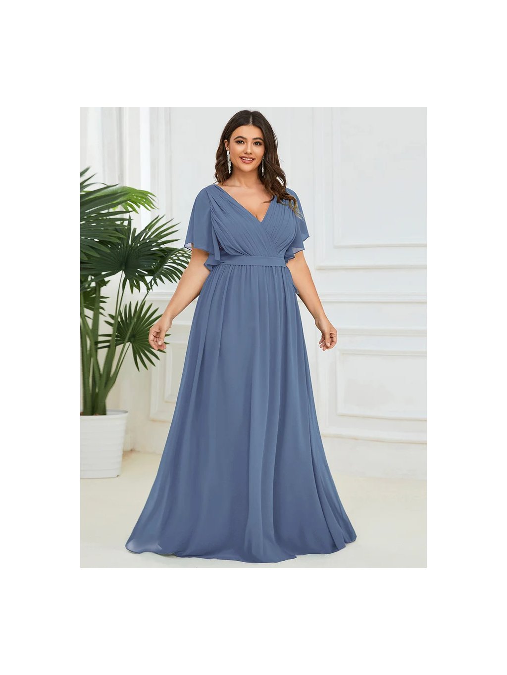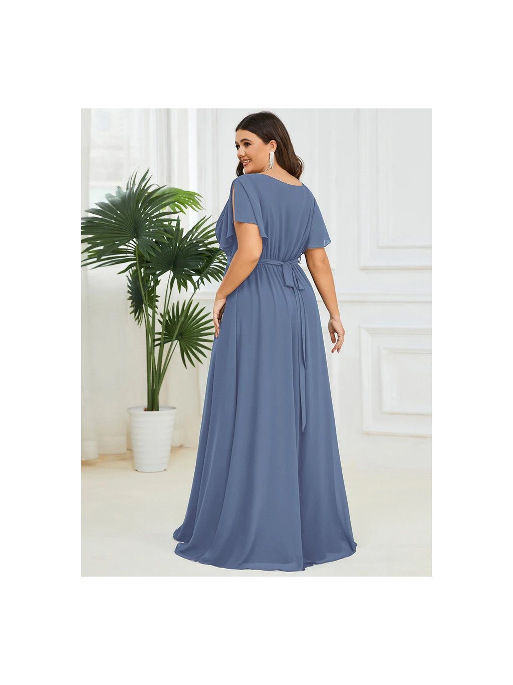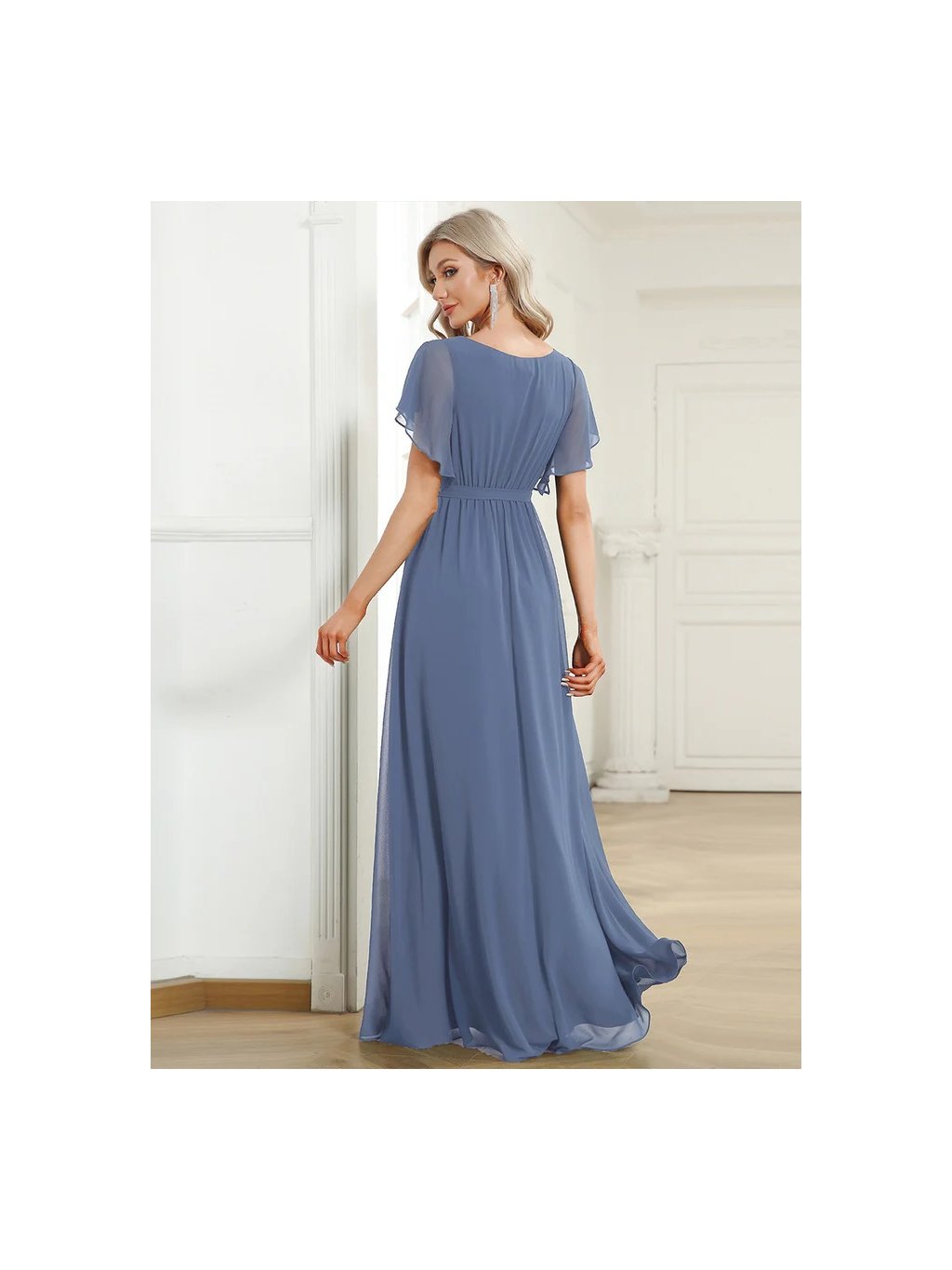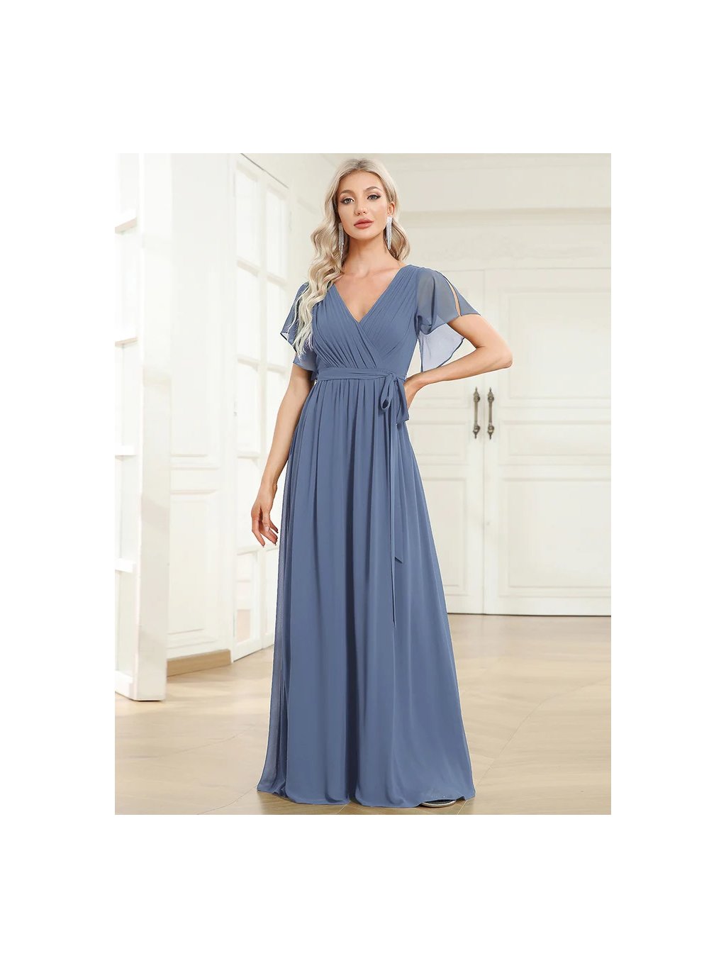 Modré šifónové šaty s rukávky. Véčkový výstřih v předu, v zadu kulaty.Pásek jde v zadu stáhnout mašlí Tento model je naprosto dokonalý ve své jednoduchosti. Sedí většině postav a velikostí.
