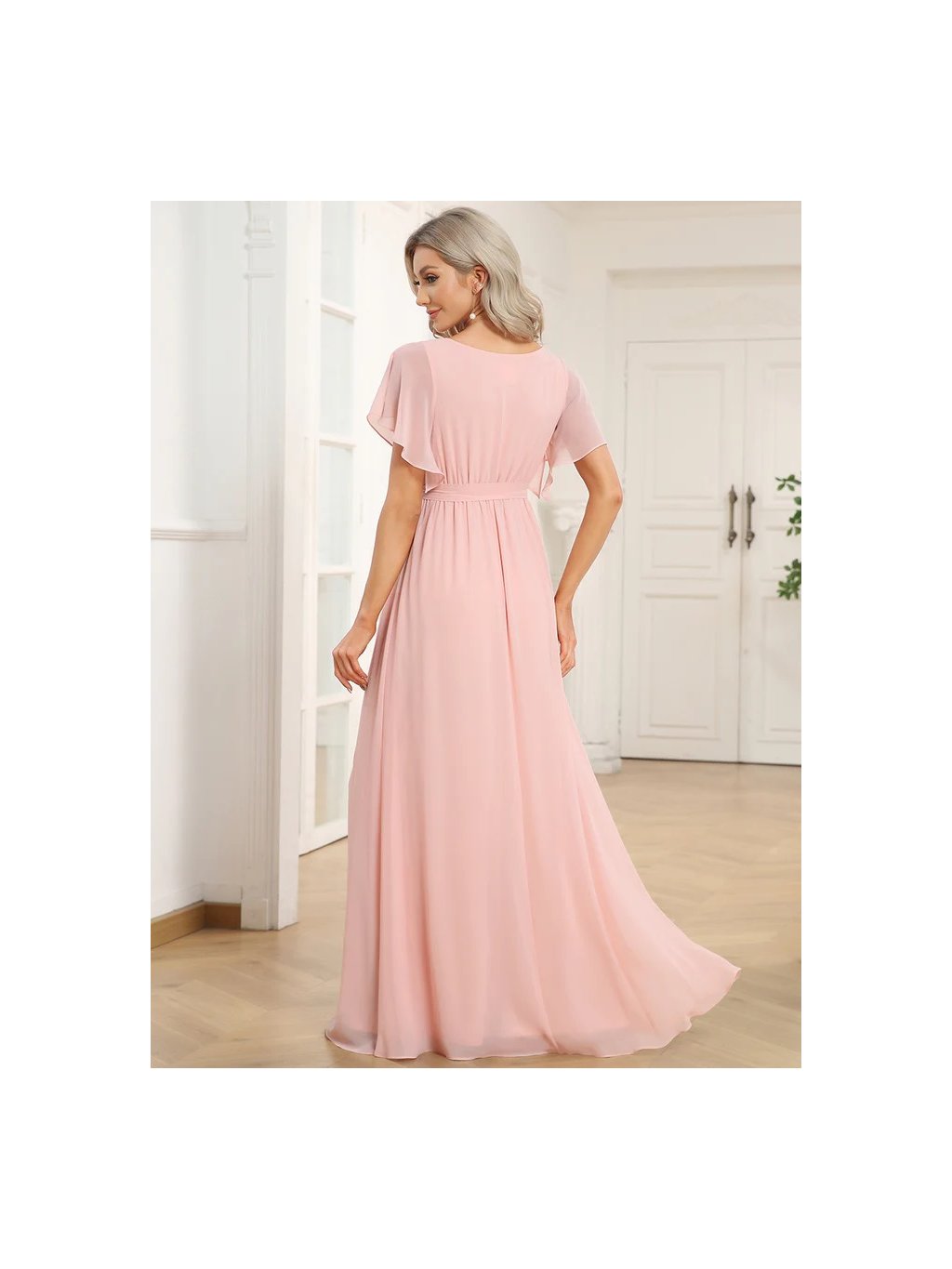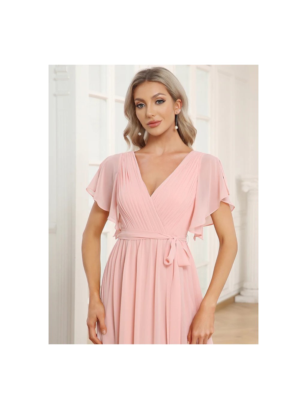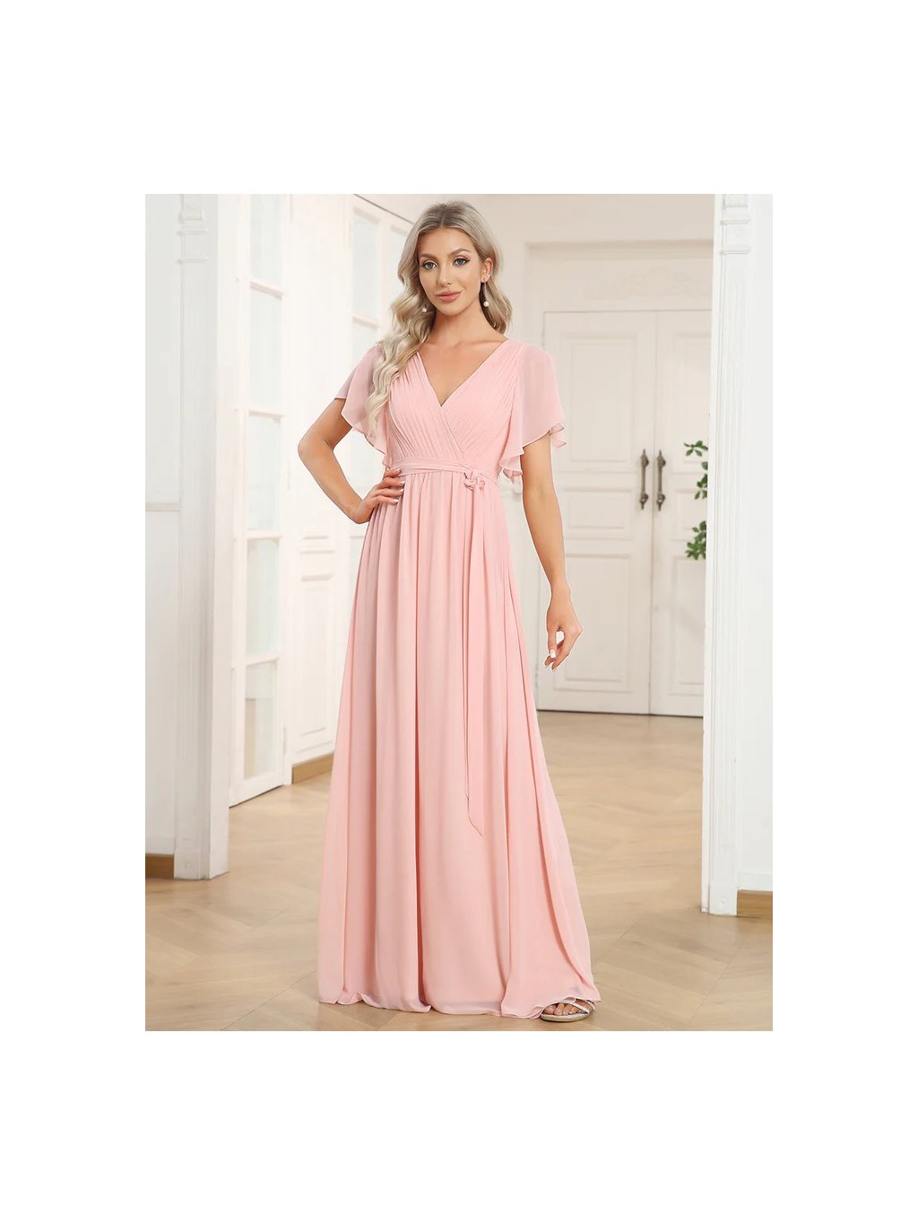 Růžové šifónové šaty s rukávky. Véčkový výstřih v předu, v zadu kulaty.Pásek jde v zadu stáhnout mašlí Tento model je naprosto dokonalý ve své jednoduchosti. Sedí většině postav a velikostí.