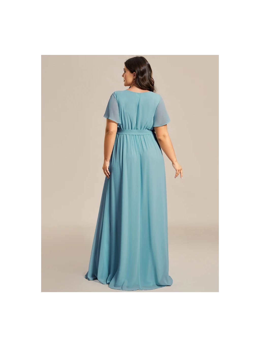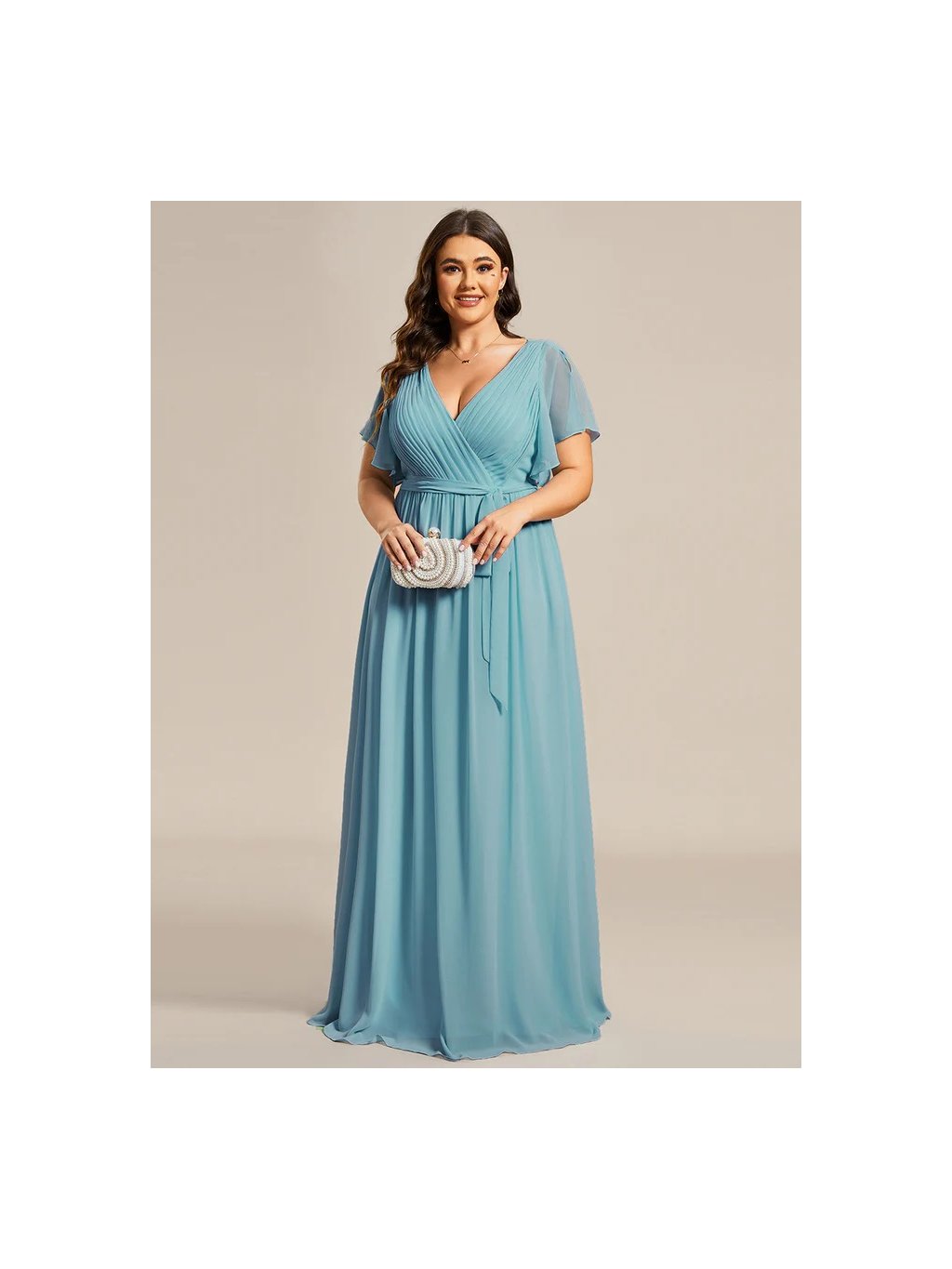 Zelené šifónové šaty s rukávky. Véčkový výstřih v předu, v zadu kulaty.Pásek jde v zadu stáhnout mašlí Tento model je naprosto dokonalý ve své jednoduchosti. Sedí většině postav a velikostí.