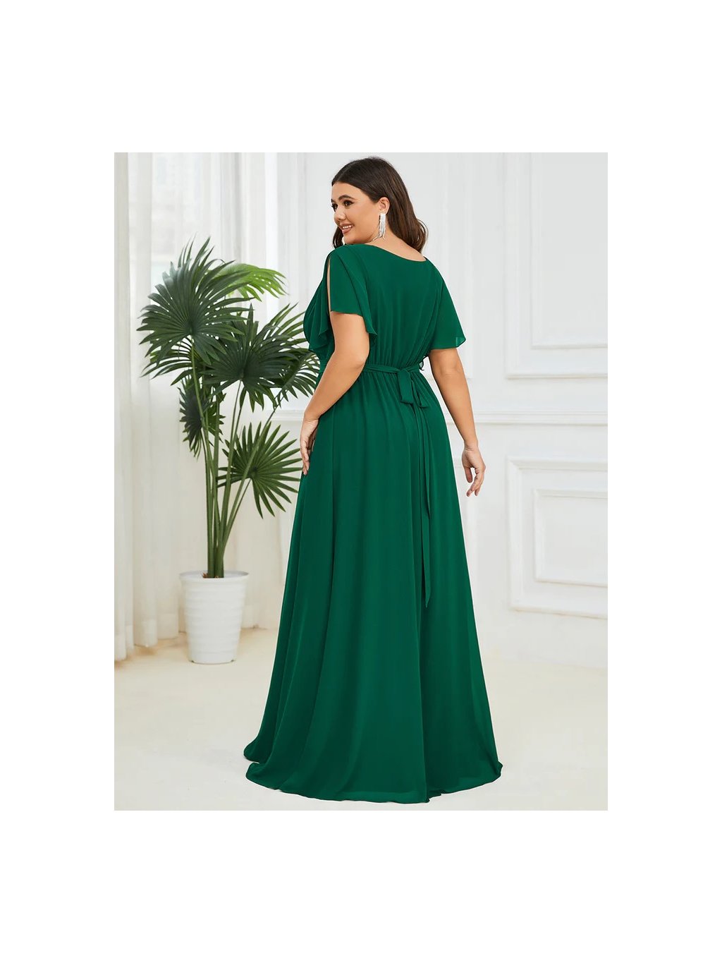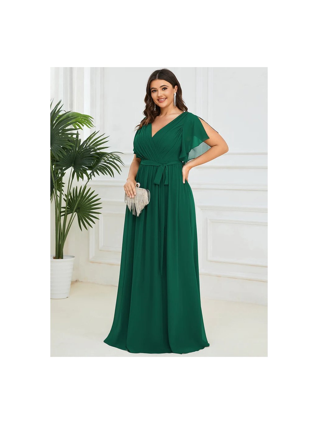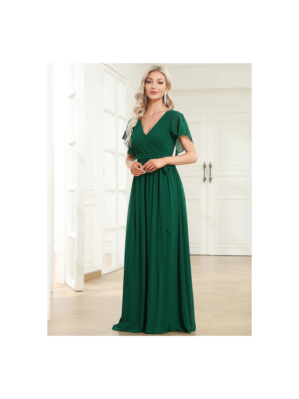 Zelené šifónové šaty s rukávky. Véčkový výstřih v předu, v zadu kulaty.Pásek jde v zadu stáhnout mašlí Tento model je naprosto dokonalý ve své jednoduchosti. Sedí většině postav a velikostí.