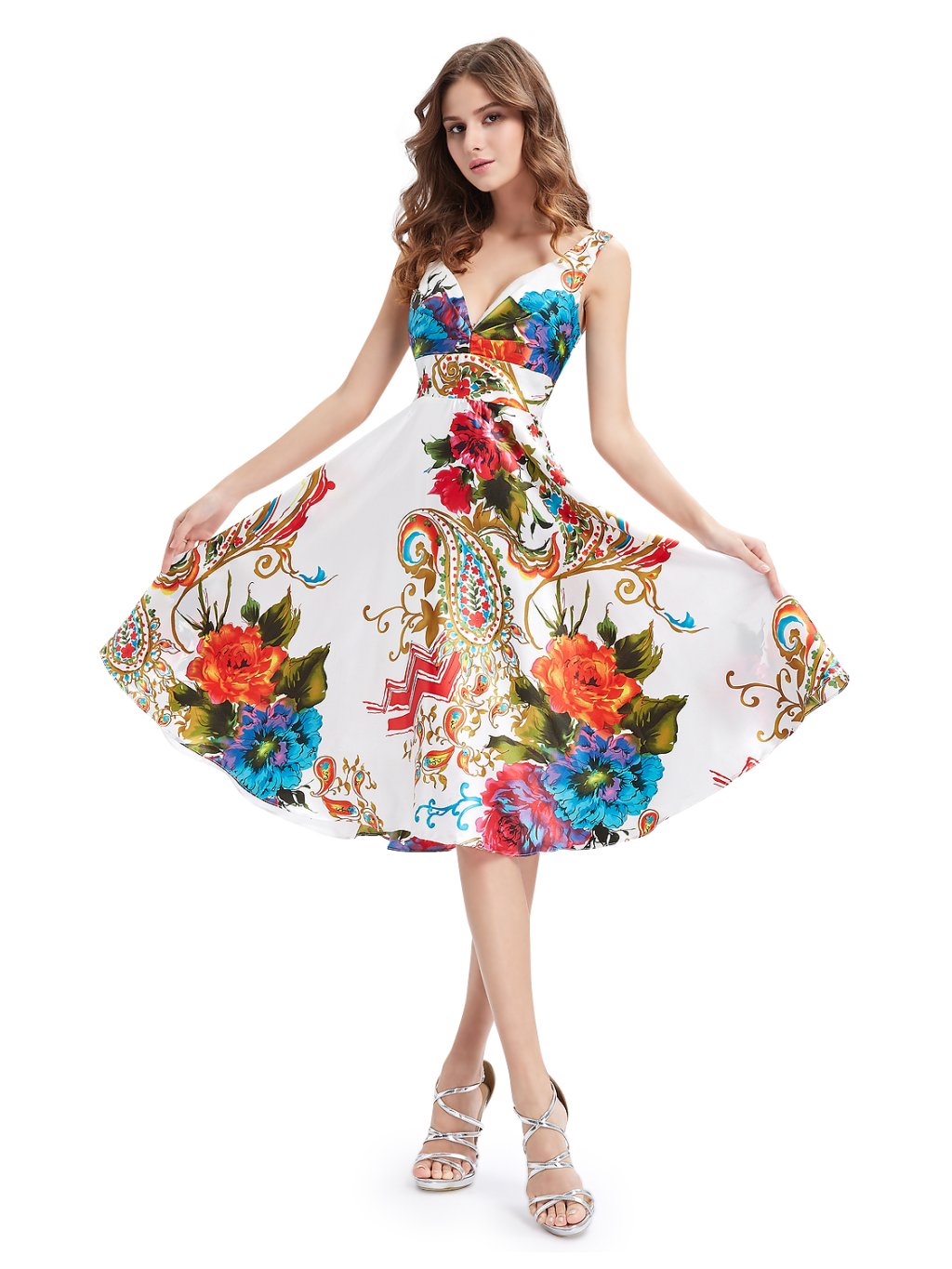 Krásné vzorované bílé šaty. Na prsou i zádech mají velký výstřih, široká ramínka. Na zádech mají skrytý zip. Šaty mají vycpávky, lze vzít bez podprsenky.