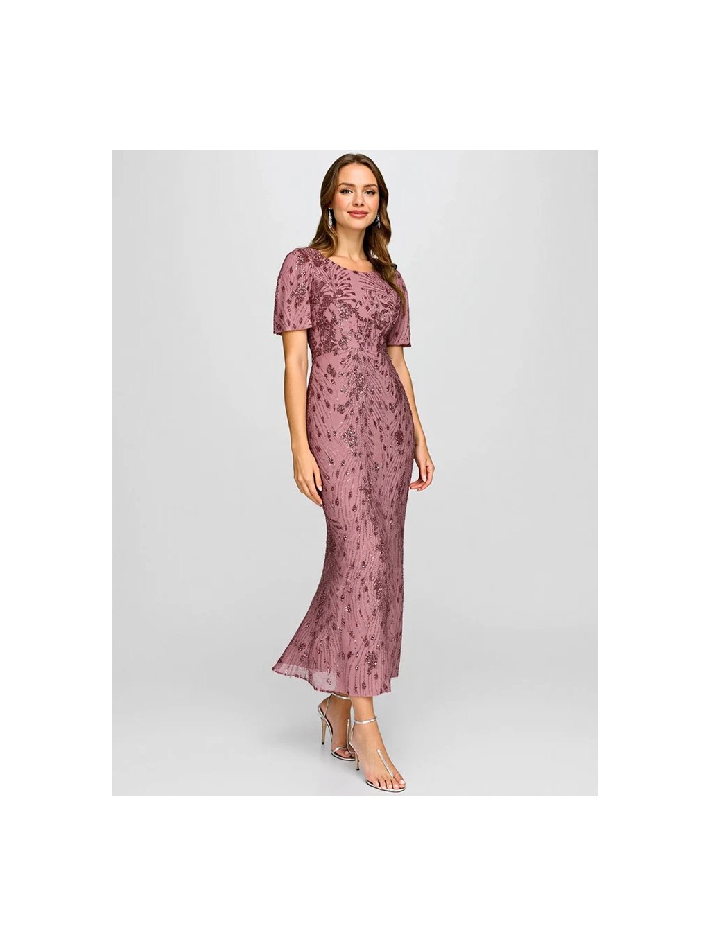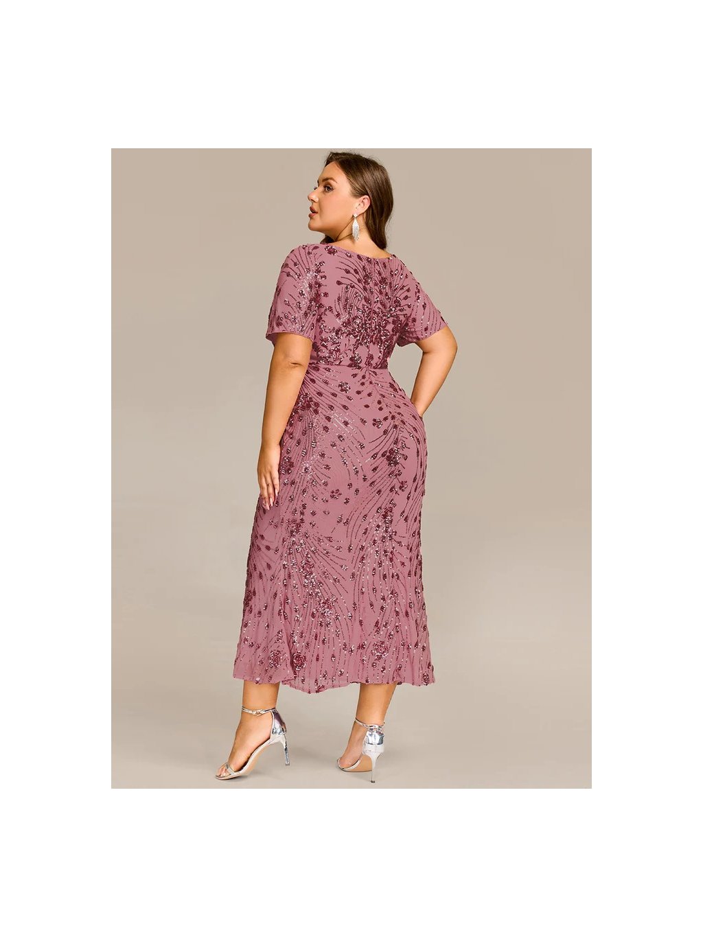 Luxusní dámské šaty orchid s odlesky. Šaty mají na prsou kulatý výstřih. Délka je pod kolena. Šatičky mají krátké rukávy.